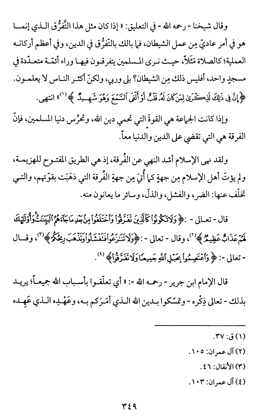 قال -تعالى-: {وَلَا تَكُونُوا كَالَّذِينَ تَفَرَّقُوا وَاخْتَلَفُوا مِنْ بَعْدِ مَا جَاءَهُمُ الْبَيِّنَاتُ وَأُولَئِكَ لَهُمْ عَذَابٌ عَظِيمٌ} (¬2)، وقال -تعالى-: {ولا تنازعوا فتفشلوا وتذهب ريحُكُم} (¬3)، وقال -تعالى-: {واعتصموا بحبل الله جميعاً ولا تفرقوا} (¬4).