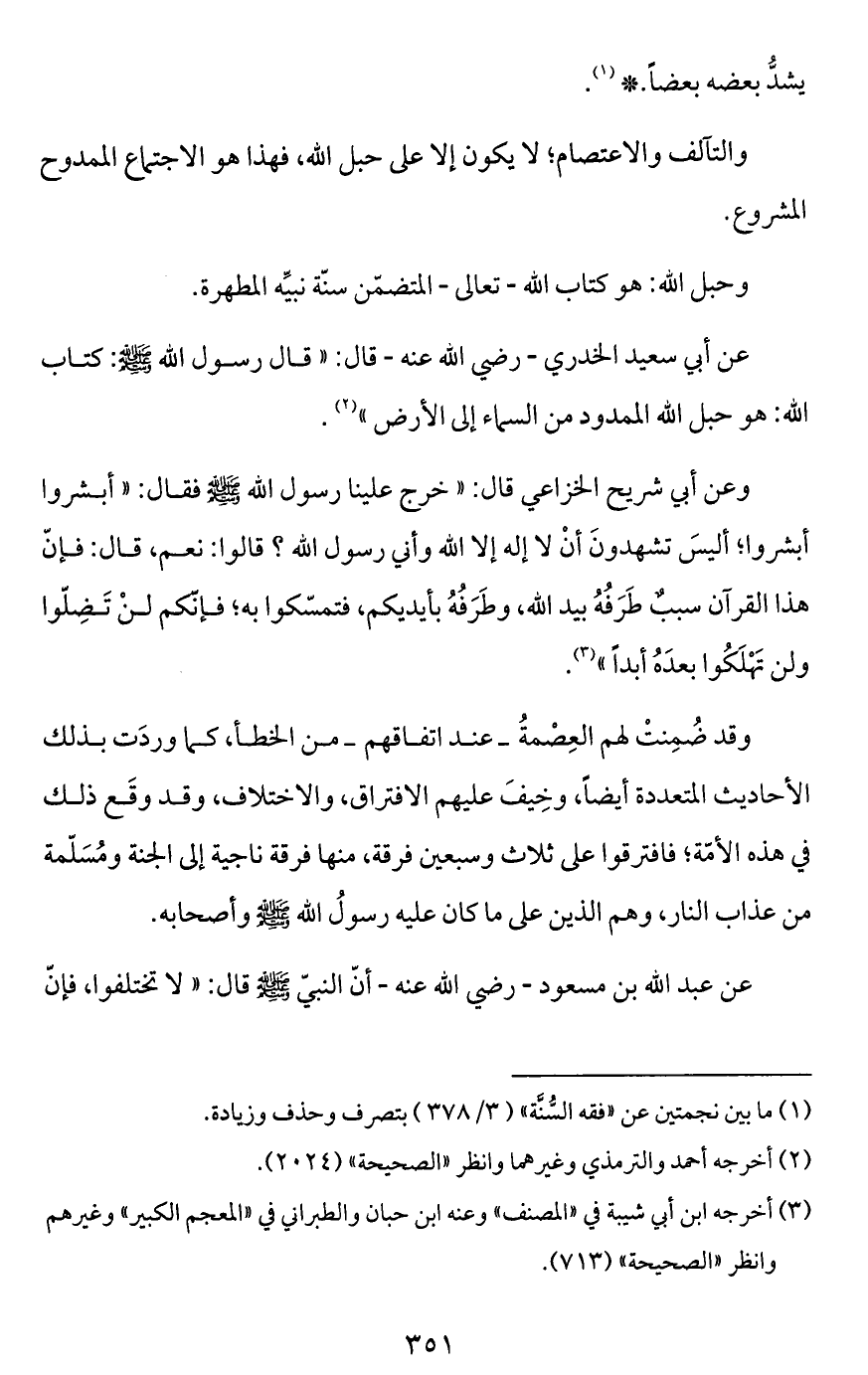 وقد ضُمِنتْ لهم العِصْمةُ -عند اتفاقهم- من الخطأ، كما وردَت بذلك الأحاديث المتعددة أيضاً، وخِيفَ عليهم الافتراق، والاختلاف، وقد وقَع ذلك في هذه الأمّة؛ فافترقوا على ثلاث وسبعين فرقة، منها فرقة ناجية إلى الجنة ومُسَلّمة من عذاب النار، وهم الذين على ما كان عليه رسولُ الله - صَلَّى اللَّهُ عَلَيْهِ وَسَلَّمَ - وأصحابه.