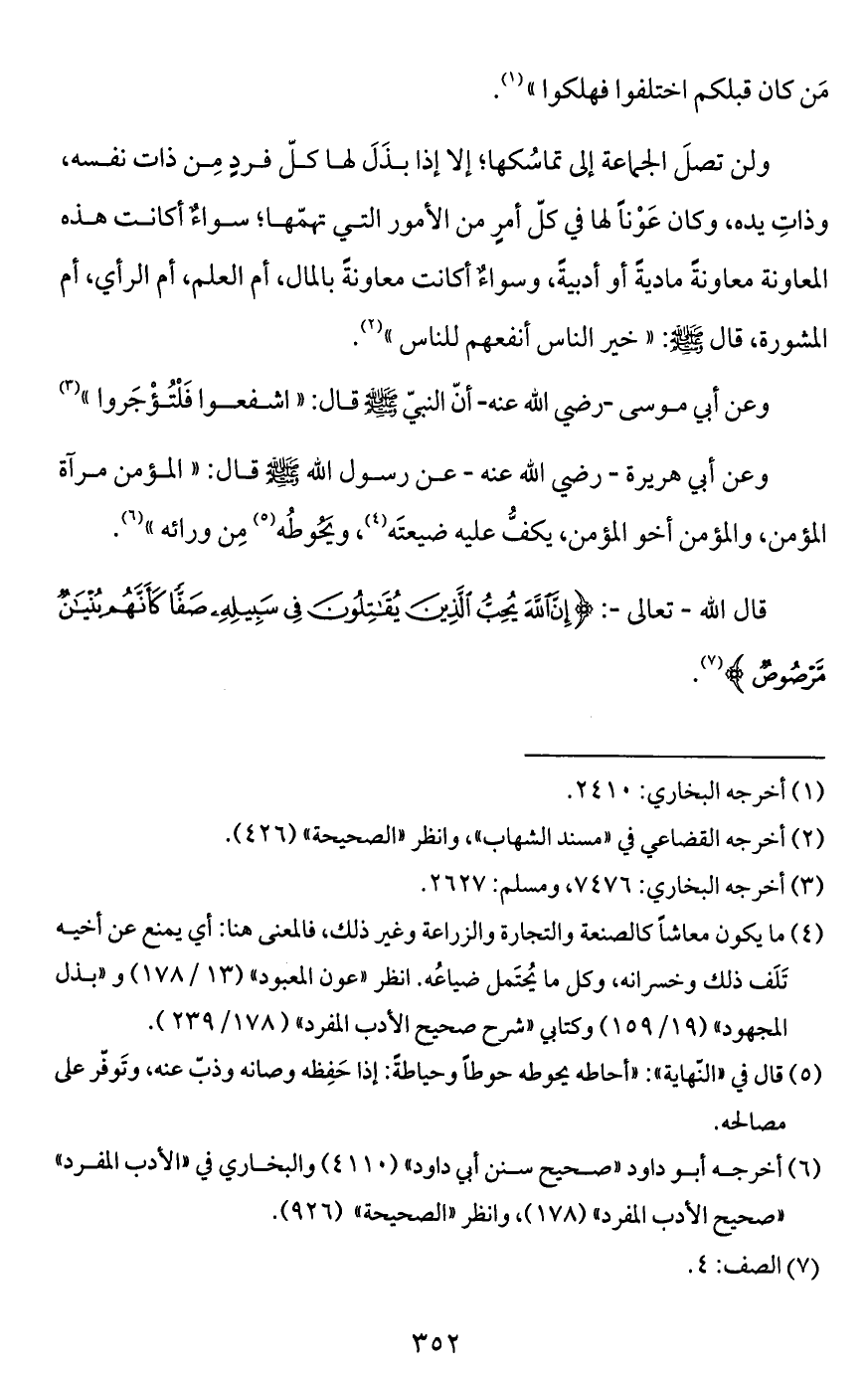 ولن تصلَ الجماعة إلى تماسُكها؛ إلاَّ إذا بذَلَ لها كلّ فردٍ مِن ذات نفسه، وذاتِ يده، وكان عَوْناً لها في كلّ أمرٍ من الأمور التي تهمّها؛ سواءٌ أكانت هذه المعاونة معاونةً ماديةً أو أدبيةً، وسواءٌ أكانت معاونةً بالمال، أم العلم، أم الرأي، أم المشورة، قال - صَلَّى اللَّهُ عَلَيْهِ وَسَلَّمَ -: "خير الناس أنفعهم للناس" (¬2).