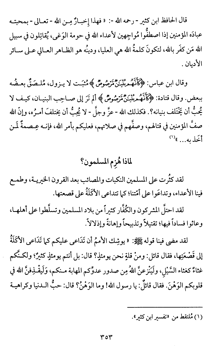 قال الحافظ ابن كثير -رحمه الله-: "فهذا إِخبارٌ مِن الله -تعالى- بمحبته عبادَه المؤمنين إذا اصطفُّوا مُواجِهين لأعداء الله في حومة الوَغى، يُقاتِلون في سبيل الله مَن كفَر بالله، لتكونَ كلمةُ الله هي العليا، ودينُه هو الظاهر العالي على سائر الأديان.
