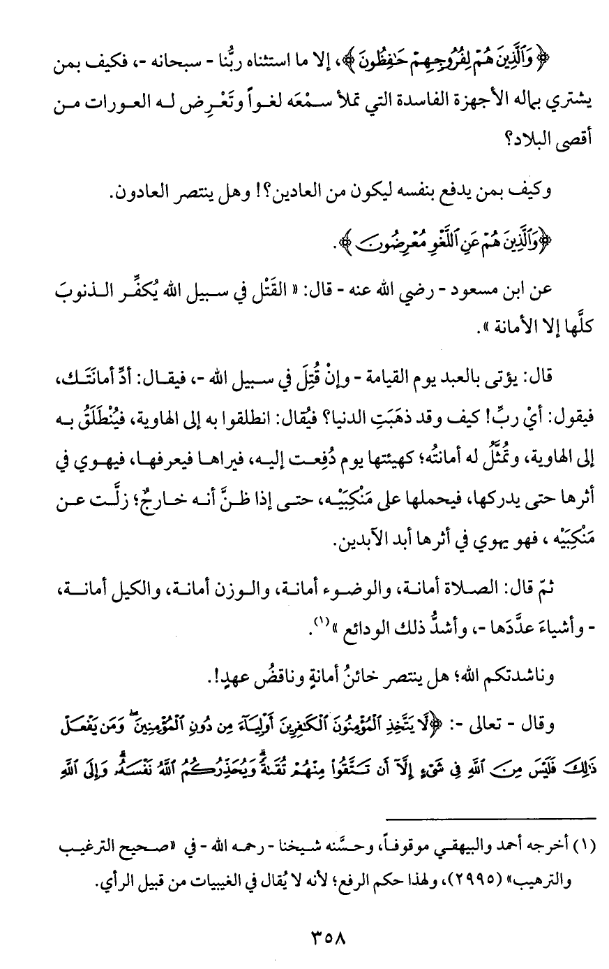 قال: يؤتى بالعبد يوم القيامة -وإنْ قُتِلَ في سبيل الله-، فيقال: أدِّ أمانَتَك، فيقول: أيْ ربِّ! كيف وقد ذهَبَتِ الدنيا؟ فيُقال: انطلقوا به إلى الهاوية، فيُنْطَلَقُ به إلى الهاوية، وتمُثَّل له أمانتُه؛ كهيئتها يوم دُفِعت إليه، فيراها فيعرفها، فيهوي في أثرها حتى يدركها، فيحملها على مَنْكِبَيْه، حتى إذا ظنَّ أنّه خارجٌ؛ زلَّت عن مَنْكِبَيْه، فهو يهوي في أثرها أبد الآبدين.