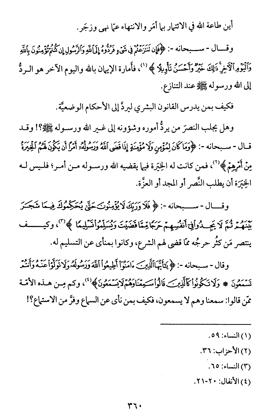 وقال -سبحانه-: {فَلَا وَرَبِّكَ لَا يُؤْمِنُونَ حَتَّى يُحَكِّمُوكَ فِيمَا شَجَرَ بَيْنَهُمْ ثُمَّ لاَ يَجِدُوا فِي أَنْفُسِهِمْ حَرَجًا مِمَّا قَضَيْتَ وَيُسَلِّمُوا تَسْلِيمًا} (¬3)، وكيف ينتصر مَن كثُر حرجُه ممّا قضى لهم الشرع، وكانوا بمنأى عن التسليم له.