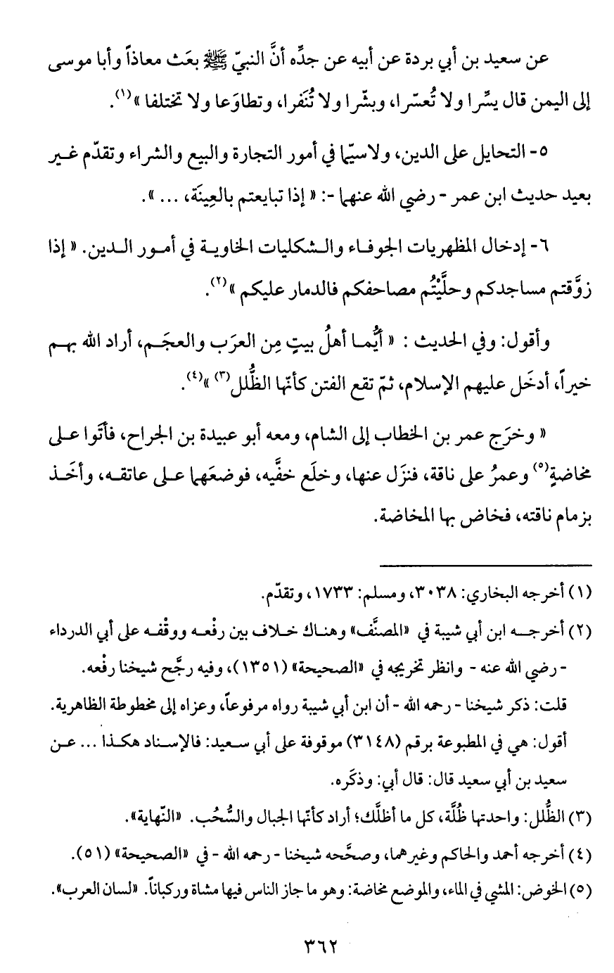 عن سعيد بن أبي بردة عن أبيه عن جدِّه أنَّ النبيّ - صَلَّى اللَّهُ عَلَيْهِ وَسَلَّمَ - بعَث معاذاً وأبا موسى إلى اليمن قال يسِّرا ولا تُعسِّرا، وبشّرا ولا تُنَفِّرا، وتطاوَعا ولا تختلفا" (¬1).