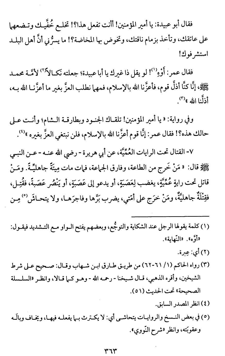 فقال عمر: أَوْهِ (¬1)! لو يقل ذا غيرك يا أبا عبيدة؛ جعلته نَكالاً (¬2) لأمَّة محمد - صَلَّى اللَّهُ عَلَيْهِ وَسَلَّمَ -، إنَّا كنَّا أذلَّ قوم، فأعزَّنا الله بالإسلام، فمهما نطلب العزَّ بغير ما أعزَّنا الله به، أذلَّنا الله" (¬3).