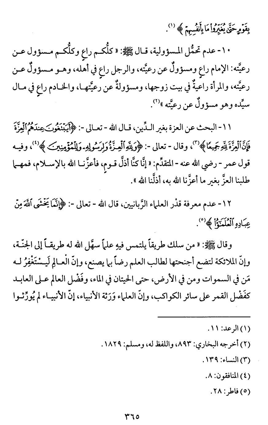 10 - عدم تحمُّل المسؤولية، قال - صَلَّى اللَّهُ عَلَيْهِ وَسَلَّمَ -: "كلُّكم راعٍ وكلُّكم مسؤول عن رعيَّته: الإمام راعٍ ومسؤولٌ عن رعيَّته، والرجل راعٍ في أهله، وهو مسؤولٌ عن رعيَّته، والمرأة راعيةٌ في بيت زوجها، ومسؤولةٌ عن رعيَّتها، والخادم راعٍ في مال سيِّده وهو مسؤولٌ عن رعيَّته" (¬2).