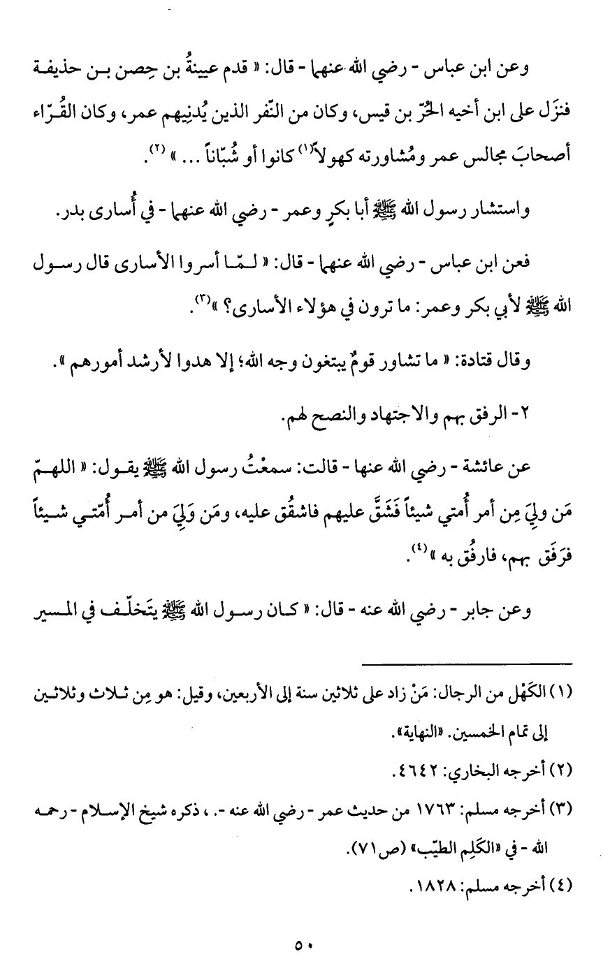 واستشار رسول الله - صَلَّى اللَّهُ عَلَيْهِ وَسَلَّمَ - أبا بكرٍ وعمر -رضي الله عنهما- في أُسارى بدر.