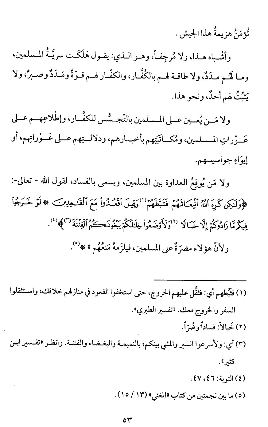 ولا مَن يُوقِعُ العداوة بين المسلمين، ويسعى بالفساد، لقول الله -تعالى-: {وَلَكِنْ كَرِهَ اللَّهُ انْبِعَاثَهُمْ فَثَبَّطَهُمْ (¬1) وَقِيلَ اقْعُدُوا مَعَ الْقَاعِدِينَ * لَوْ خَرَجُوا فِيكُمْ مَا زَادُوكُمْ إِلَّا خَبَالًا (¬2) وَلَأَوْضَعُوا خِلَالَكُمْ يَبْغُونَكُمُ الْفِتْنَةَ (¬3)} (¬4).