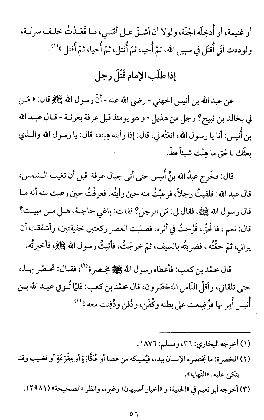 قال: فخَرج عبدُ الله بنُ أُنيس حتى أتى جبال عرفة قبل أن تغيب الشمس، قال عبد الله: فلقيتُ رجلاً، فرعبْتُ منه حين رأيتُه، فعرفْتُ حين رعبت منه أنه ما قال رسول الله - صَلَّى اللَّهُ عَلَيْهِ وَسَلَّمَ -، فقال لي: مَن الرجل؟ فقلت: باغي حاجة، هل من مبيت؟ قال: نعم، فالحْقْ، فَرُحتُ في أثره، فصليت العصر ركعتين خفيفتين، وأشفقت أن يراني، ثمّ لحقْتُه، فضربتُه بالسيف، ثمّ خرجْتُ، فأتيتُ رسول الله - صَلَّى اللَّهُ عَلَيْهِ وَسَلَّمَ -، فأخبرتُه.