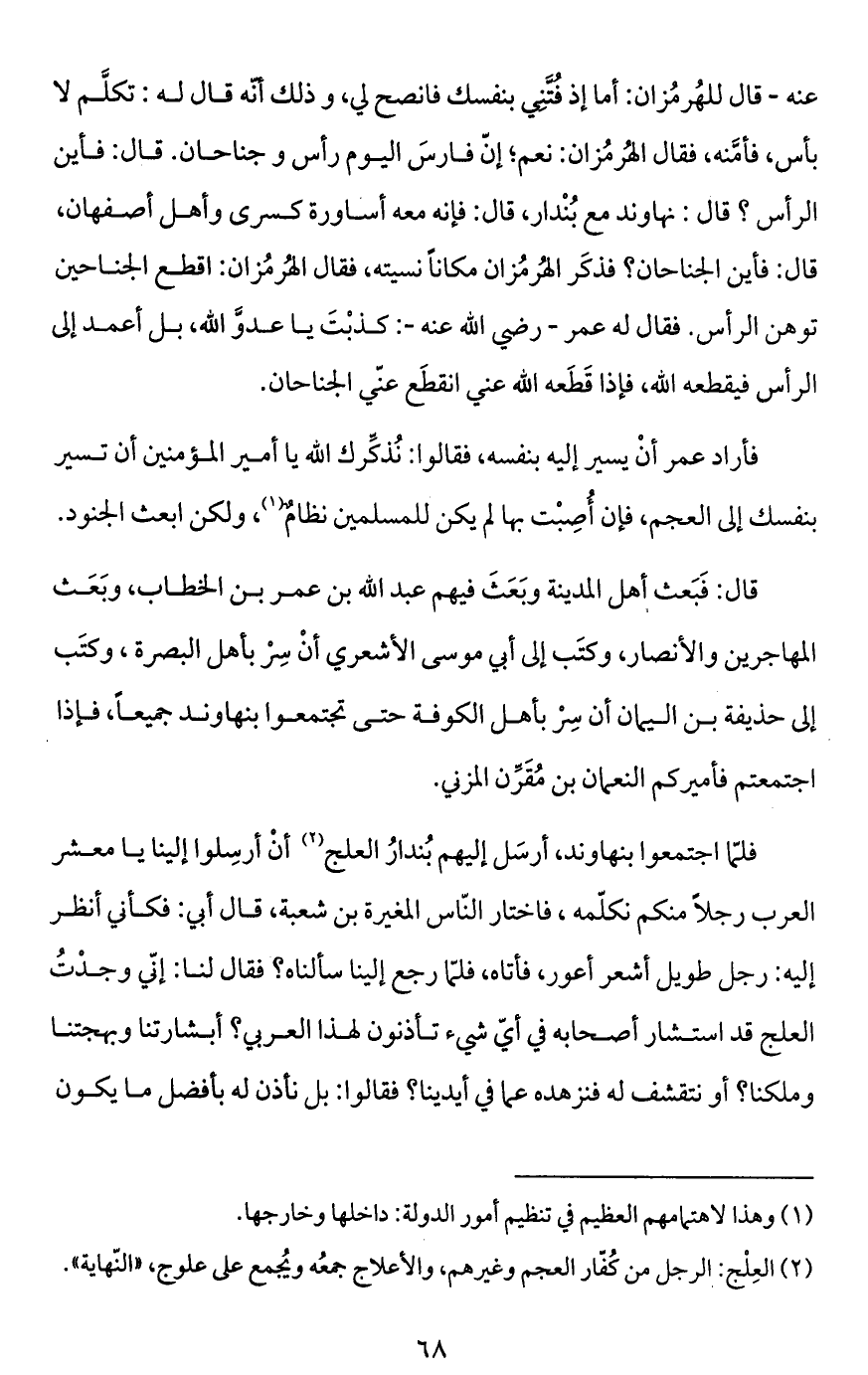 عنه- قال للهُرمُزان: أما إذ فُتَّنِي بنفسك فانصح لي، وذلك اّنه قال له: تكلَّم لا بأس، فأمَّنه، فقال الهُرمُزان: نعم؛ إنّ فارسَ اليوم رأس وجناحان. قال: فأين الرأس؟ قال: نهاوند مع بُنْدار، قال: فإنه معه أساورة كسرى وأهل أصفهان، قال: فأين الجناحان؟ فذكَر الهُرمُزان مكاناً نسيته، فقال الهُرمُزان: اقطع الجناحين توهن الرأس. فقال له عمر -رضي الله عنه-: كذبْتَ يا عدوَّ الله، بل أعمد إلى الرأس فيقطعه الله، فإذا قَطَعه الله عني انقطَع عنّي الجناحان.