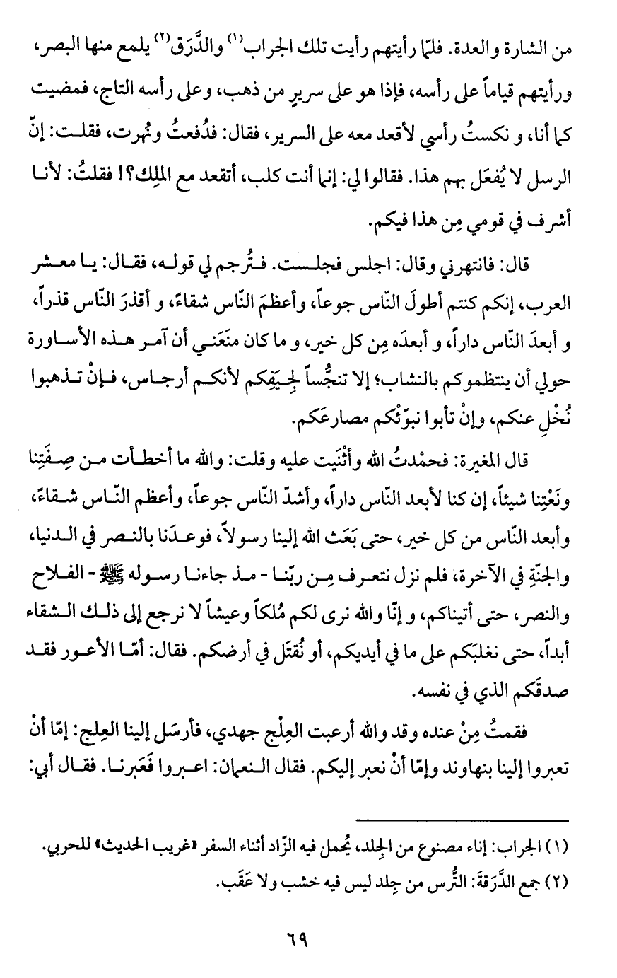 قال: فانتهرني وقال: اجلس فجلست. فتُرجم لي قوله، فقال: يا معشر العرب، إنكم كنتم أطولَ النّاس جوعاً، وأعظمَ النّاس شقاءً، وأقذرَ النّاس قذراً، وأبعدَ النّاس داراً، وأبعدَه مِن كل خير، وما كان منَعَني أن آمر هذه الأساورة حولي أن ينتظموكم بالنشاب؛ إلاَّ تنجُّساً لجِيَفِكم لأنكم أرجاس، فإنْ تذهبوا نُخْلِ عنكم، وإنْ تأبوا نبوّئْكم مصارعَكم.