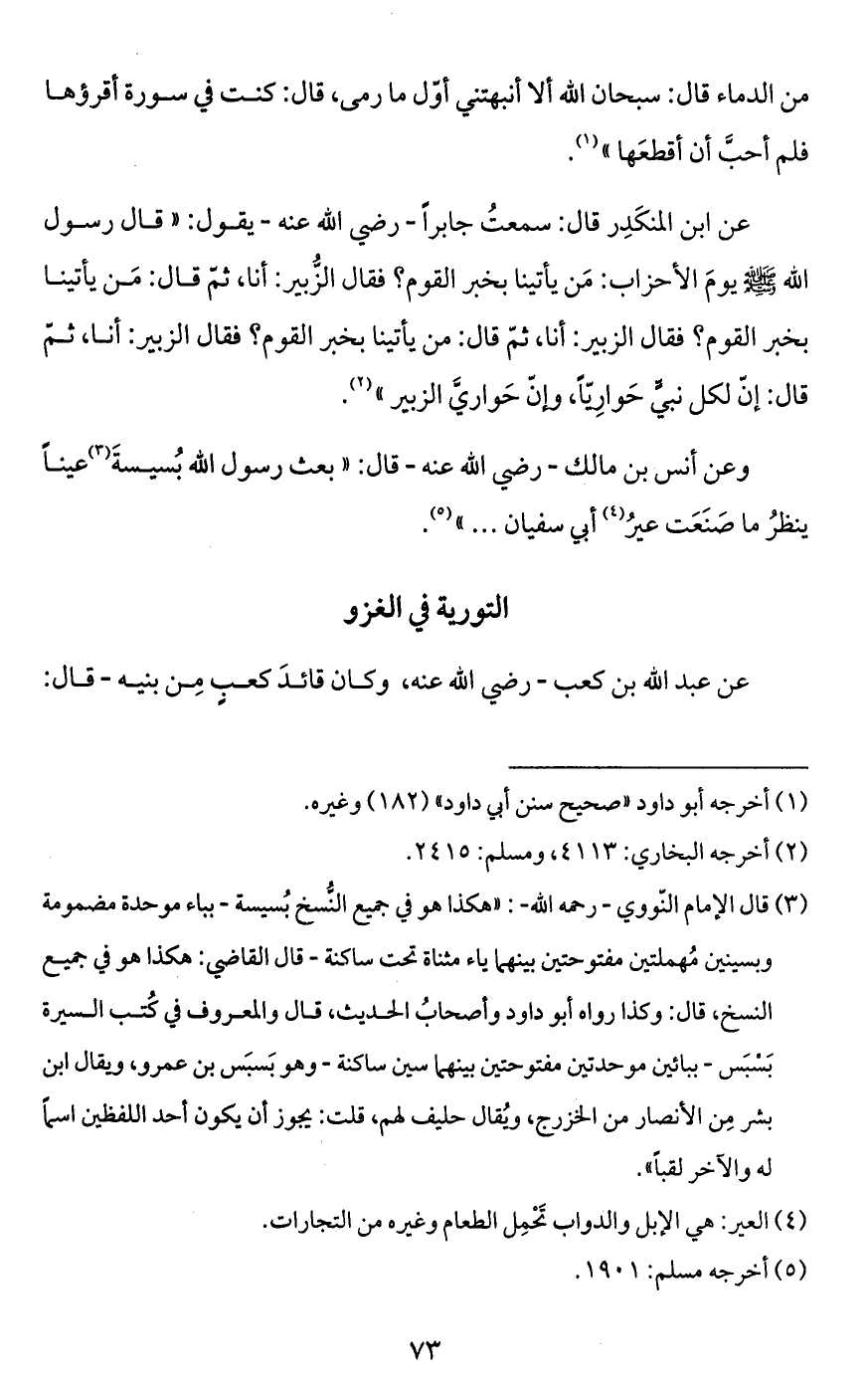 (¬3) قال الإمام النّووي -رحمه الله-: "هكذا هو في جميع النُّسخ بُسيسة -بباء موحدة مضمومة وبسينين مُهملتين مفتوحتين بينهما ياء مثناة تحت ساكنة- قال القاضي: هكذا هو في جميع النسخ، قال: وكذا رواه أبو داود وأصحابُ الحديث، قال والمعروف في كُتب السيرة بَسْبَس -ببائين موحدتين مفتوحتين بينهما سين ساكنة- وهو بَسبَس بن عمرو، ويقال ابن بشر مِن الأنصار من الخزرج، ويُقال حليف لهم، قلت: يجوز أن يكون أحد اللفظين اسماً له والآخر لقباً".