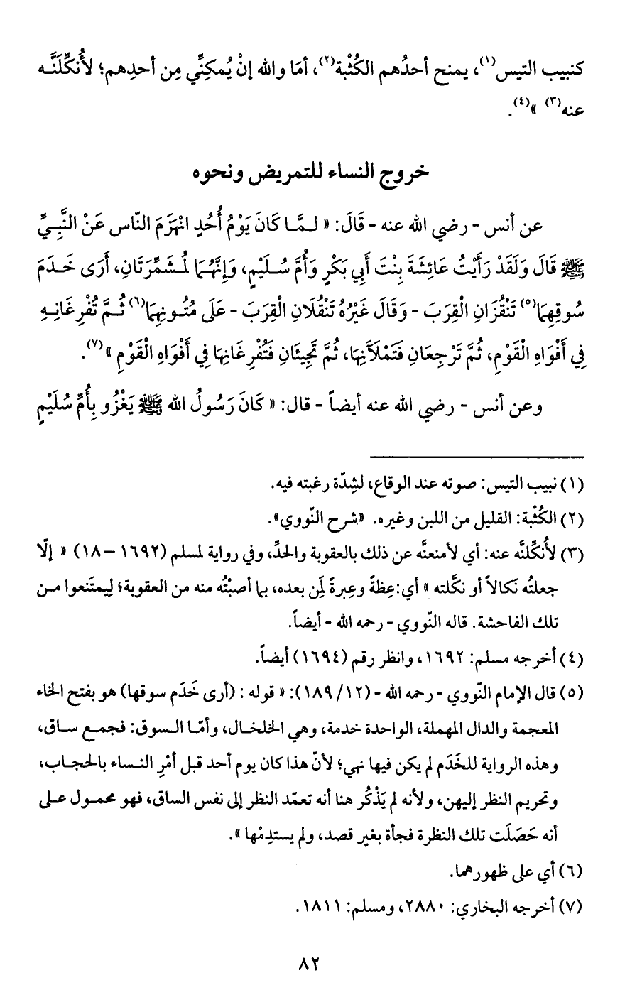 (¬5) قال الإمام النّووي -رحمه الله- (12/ 189): "قوله: (أرى خَدَم سوقها) هو بفتح الخاء المعجمة والدال المهملة، الواحدة خدمة، وهي الخلخال، وأمّا السوق: فجمع ساق، وهذه الرواية للخَدَم لم يكن فيها نهي؛ لأنّ هذا كان يوم أحد قبل أمْرِ النساء بالحجاب، وتحريم النظر إليهن، ولأنه لم يَذكُر هنا أنه تعمّد النظر إلى نفس الساق، فهو محمول على أنه حَصَلَت تلك النظرة فجأة بغير قصد، ولم يستدِمْها".