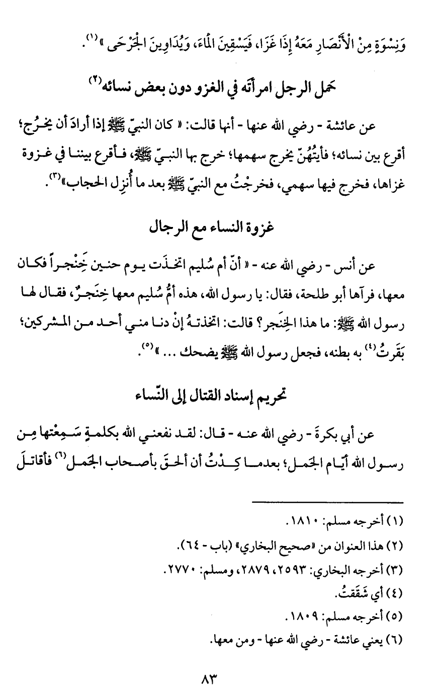 عن عائشة -رضي الله عنها- أنها قالت: "كان النبيّ - صَلَّى اللَّهُ عَلَيْهِ وَسَلَّمَ - إذا أرادَ أن يخرُج؛ أقرع بين نسائه؛ فأيتُهُنّ يخرج سهمها؛ خرج بها النبيّ - صَلَّى اللَّهُ عَلَيْهِ وَسَلَّمَ -، فأقرع بيننا في غزوة غزاها، فخرج فيها سهمي، فخرجْتُ مع النبيّ - صَلَّى اللَّهُ عَلَيْهِ وَسَلَّمَ - بعد ما أُنزِل الحجاب" (¬3).