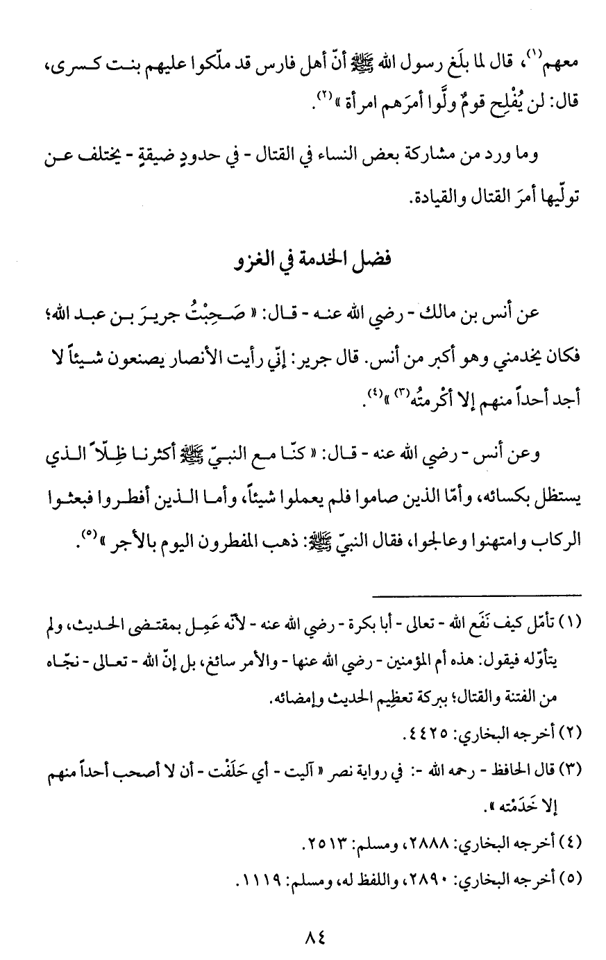 (¬1) تأمّل كيف نَفَع الله -تعالى- أبا بكرة -رضي الله عنه- لأنه عَمِل بمقتضى الحديث، ولم يتأوّله فيقول: هذه أم المؤمنين -رضي الله عنها- والأمر سائغ، بل إنّ الله -تعالى- نجّاه من الفتنة والقتال؛ ببركة تعظِيم الحديث وإمضائه.