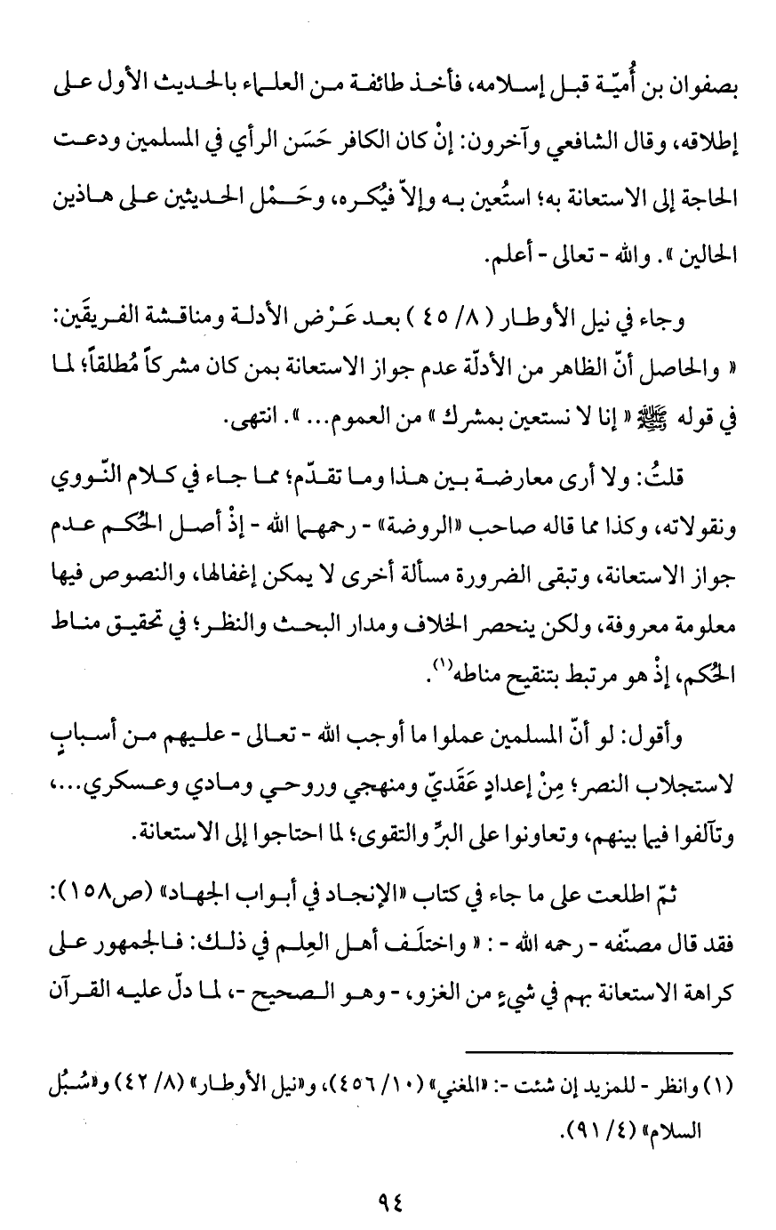 وجاء في نيل الأوطار (8/ 45) بعد عَرْض الأدلة ومناقشة الفريقَين: "والحاصل أنّ الظاهر من الأدلّة عدم جواز الاستعانة بمن كان مشركاً مُطلقاً؛ لما في قوله - صَلَّى اللَّهُ عَلَيْهِ وَسَلَّمَ - "إنا لا نستعين بمشرك" من العموم ... ". انتهى.