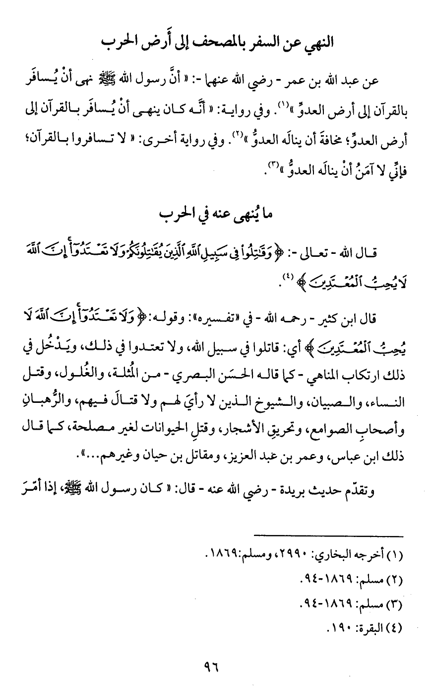 عن عبد الله بن عمر -رضي الله عنهما-: "أنَّ رسول الله - صَلَّى اللَّهُ عَلَيْهِ وَسَلَّمَ - نهى أنْ يُسافَر بالقرآن إلى أرض العدوِّ" (¬1). وفي رواية: "أنَّه كان ينهى أنْ يُسافَر بالقرآن إلى أرض العدوِّ؛ مخافةَ أن ينالَه العدوُّ" (¬2). وفي رواية أخرى: "لا تسافروا بالقرآن؛ فإنّي لا آمَنُ أنْ ينالَه العدوُّ" (¬3).