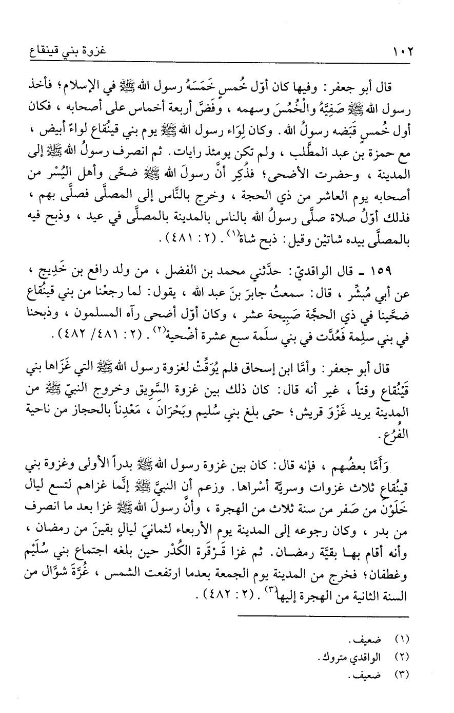 ١٥٩ - قال الواقديّ: حدَّثني محمد بن الفضل، من ولد رافع بن خَدِيج، عن أبي مُبشِّر، قال: سمعتُ جابرَ بنَ عبد الله، يقول: لما رجعْنا من بني قينُقاع ضحَّينا في ذي الحجَّة صَبِيحة عشر، وكان أوّل أضحى رآه المسلمون، وذبحنا في بني سلِمة فَعُدَّت في بني سلَمة سبع عشرة أضحية (٢). (٢: ٤٨١/ ٤٨٢).