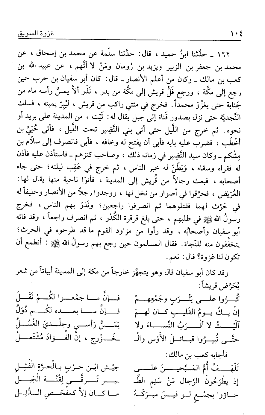١٦٢ - حدَّثنا ابنُ حميد، قال: حدَّثنا سلَمة عن محمد بن إسحاق، عن محمد بن جعفر بن الزبير ويزيد بن رُومان ومَنْ لا أتَّهم، عن عبيد الله بن كعب بن مالك - وكان من أعلم الأنصار - قال: كان أبو سفيان بن حرب حين رجع إلى مكّة، ورجع فَلُّ قريش إلى مكَّة من بدر، نَذَر ألَّا يمسَّ رأسه ماء من جَنابة حتى يغزُوَ محمدًا. فخرج في مئتي راكب من قريش، ليُبِرّ يمينه، فسلك النَّجديَّة حتى نزل بصدور قَناة إلى جبل يقال له: تَيت، من المدينة على بريد أو نحوه. ثم خرج من اللَّيل حتى أتى بني النَّضِير تحت اللَّيل، فأتى حُييَّ بن أخْطَب، فضرب عليه بابه فأبى أن يفتح له وخافه، فأبى فانصرف إلى سلّام بن مِشْكم -وكان سيد النَّضِير في زمانه ذلك، وصاحب كنزهم- فاستأذن عليه فأذن له فقراه وسقاه، وَبَطَنَ له خبر الناس، ثم خرج في عَقِب ليلته؛ حتى جاء أصحابه، فبعث رجالًا من قُريش إلى المدينة، فأتوْا ناحية منها يقال لها: العُرَيض، فحرِّقوا في أصوار من نخل لها، ووجدوا رجلًا من الأنصار وحليفًا له في حَرْث لهما فقتلوهما ثم انصرفوا راجعين؛ ونَذرَ بهم الناس، فخرج رسولُ الله - صلى الله عليه وسلم - في طلبهم، حتى بلغ قرقرة الكُدْر، ثم انصرف راجعًا، وقد فاته أبو سفيان وأصحابُه، وقد رأوا من مزاود القوم ما قد طرحوه في الحرث؛ يتخفَّفون منه للنّجاة. فقال المسلمون حين رجع بهم رسولُ الله - صلى الله عليه وسلم -: أنطمع أن تكون لنا غزوة؟ قال: نعم.