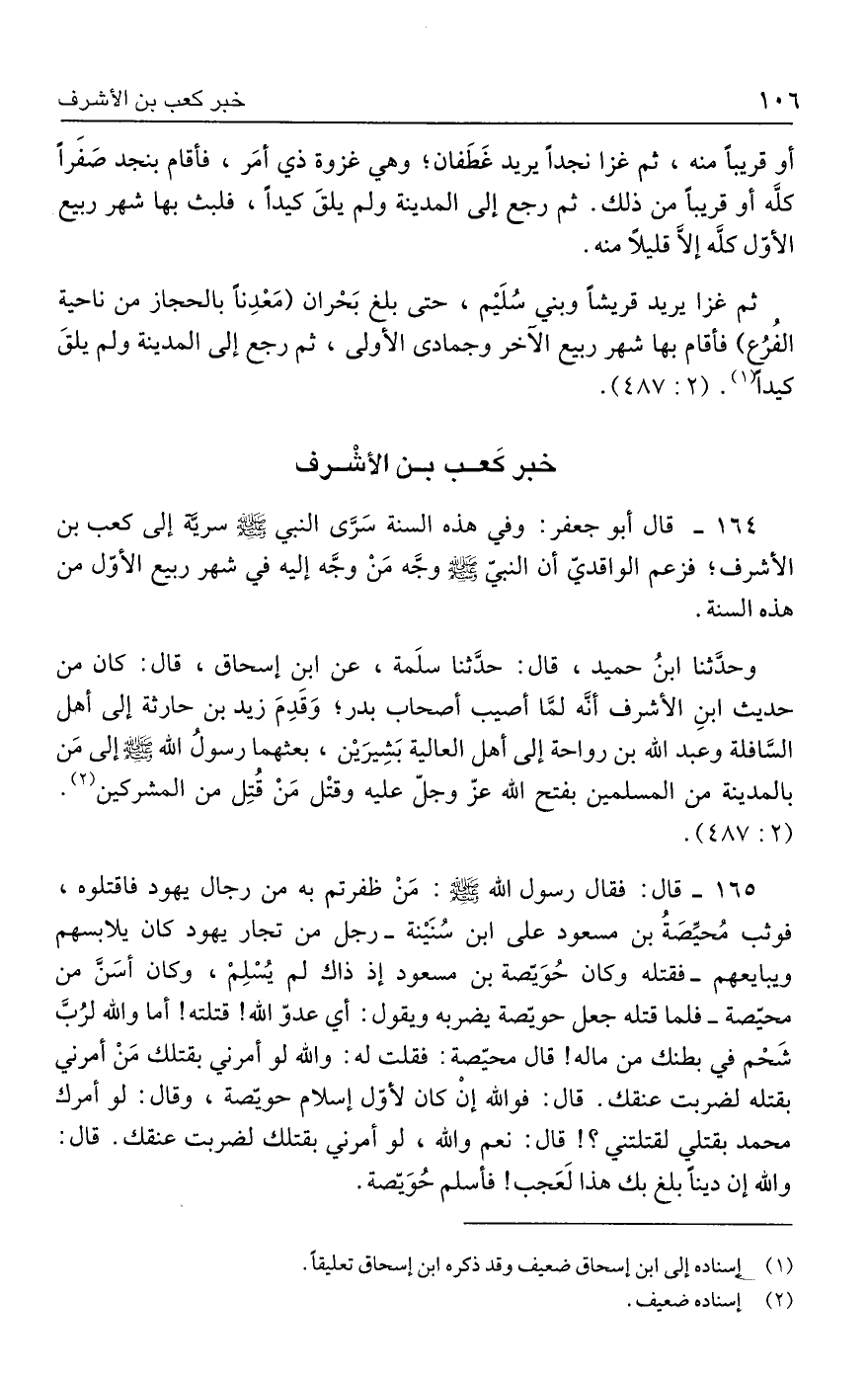١٦٥ - قال: فقال رسول الله - صلى الله عليه وسلم -: مَنْ ظفرتم به من رجال يهود فاقتلوه، فوثب مُحيِّصَةُ بن مسعود على ابن سُنَينة - رجل من تجار يهود كان يلابسهم ويبايعهم - فقتله وكان حُوَيّصة بن مسعود إذ ذاك لم يُسْلِمْ، وكان أسَنَّ من محيّصة- فلما قتله جعل حويّصة يضربه ويقول: أي عدوّ الله! قتلته! أما والله لرُبَّ شَحْم في بطنك من ماله! قال محيّصة: فقلت له: والله لو أمرني بقتلك مَنْ أمرني بقتله لضربت عنقك. قال: فوالله إنْ كان لأوّل إسلام حويّصة، وقال: لو أمرك محمد بقتلي لقتلتني؟ ! قال: نعم والله، لو أمرني بقتلك لضربت عنقك. قال: والله إن دينًا بلغ بك هذا لَعَجب! فأسلم حُوَيّصة.