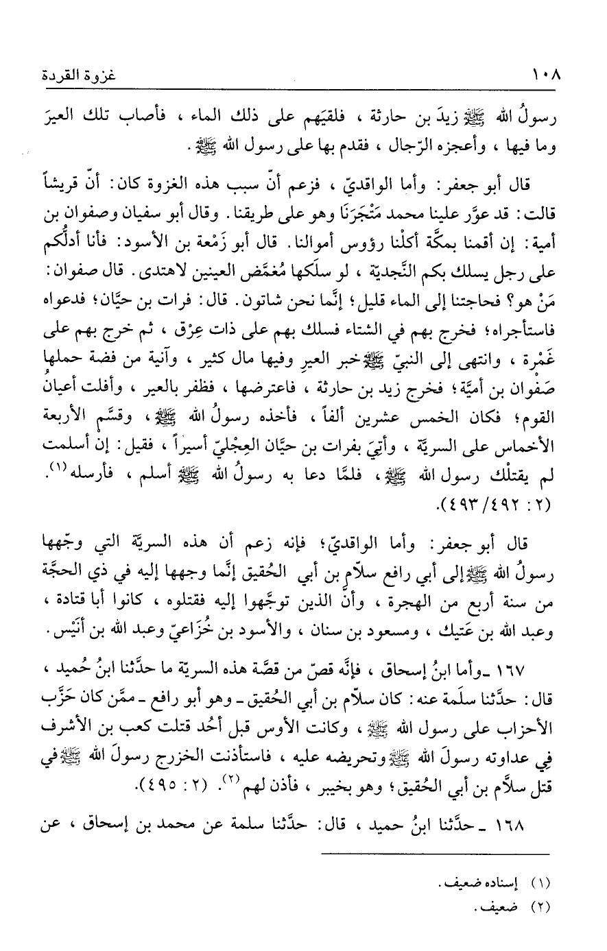 ١٦٧ - وأما ابنُ إسحاق، فإنَّه قصّ من قصَّة هذه السريّة ما حدَّثنا ابنُ حُميد، قال: حدَّثنا سلَمة عنه: كان سلّام بن أبي الحُقيق -وهو أبو رافع- ممَّن كان حَزَّب الأحزاب على رسول الله - صلى الله عليه وسلم -، وكانت الأوس قبل أحُد قتلت كعب بن الأشرف فِي عداوته رسولَ الله - صلى الله عليه وسلم - وتحريضه عليه، فاستأذنت الخزرج رسولَ الله - صلى الله عليه وسلم - في قتل سلَّام بن أبي الحُقيق؛ وهو بخيبر، فأذن لهم (٢). (٢: ٤٩٥).