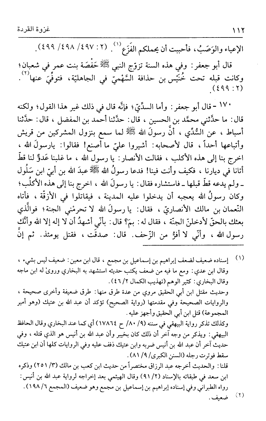 قلنا: والحديث أخرجه عبد الرزاق مختصرًا من حديث ابن كعب بن مالك (٣/ ٢٥١) وذكره ابن سعد في طبقاته بالإسناد (٢/ ٩١) وقال الهيثمي بعد إخراجه لرواية عبد الله بن أنيس: رواه الطبراني وفي إسناده إبراهيم بن إسماعيل بن مجمع وهو ضعيف (المجمع ٦/ ١٩٨).