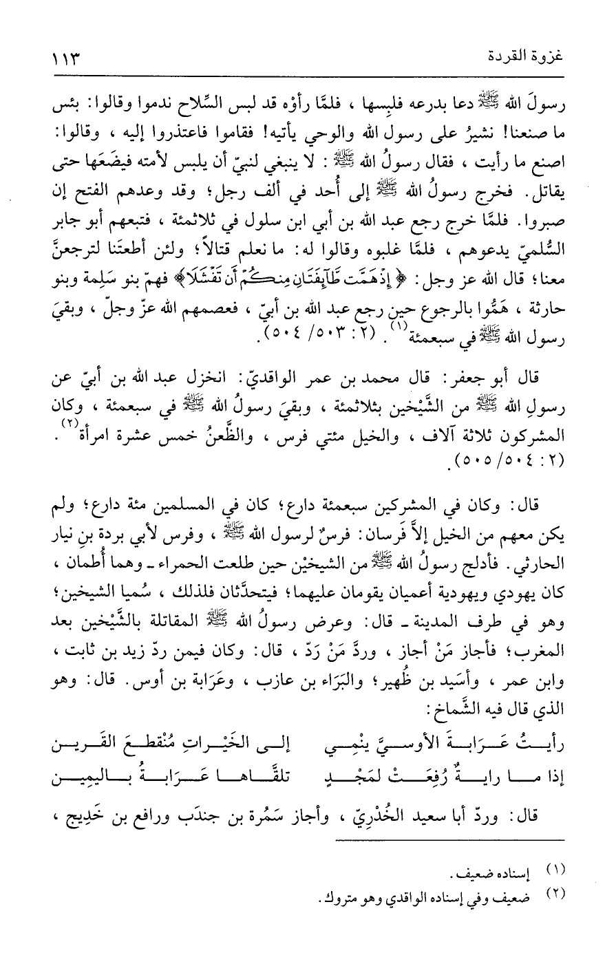 قال: وكان في المشرِكين سبعمئة دارع؛ كان في المسلمين مئة دارع؛ ولم يكن معهم من الخيل إلَّا فرسان: فرس لرسول الله - صلى الله عليه وسلم -، وفرس لأبي بردة بن نيار الحارثي. فأدلج رسولُ الله - صلى الله عليه وسلم - من الشيخين حين طلعت الحمراء -وهما أُطمان، كان يهودي ويهودية أعميان يقومان عليهما؛ فيتحدَّثان فلذلك، سُميا الشيخين؛ وهو في طرف المدينة- قال: وعرض رسولُ الله - صلى الله عليه وسلم - المقاتلة بالشَّيخين بعد المغرب؛ فأجاز مَنْ أجاز، وردَّ مَنْ رَدّ، قال: وكان فيمن ردّ زيد بن ثابت، وابن عمر، وأسَيد بن ظُهير؛ والبَرَاء بن عازب، وعَرَابة بن أوس. قال: وهو الذي قال فيه الشَّماخ:
