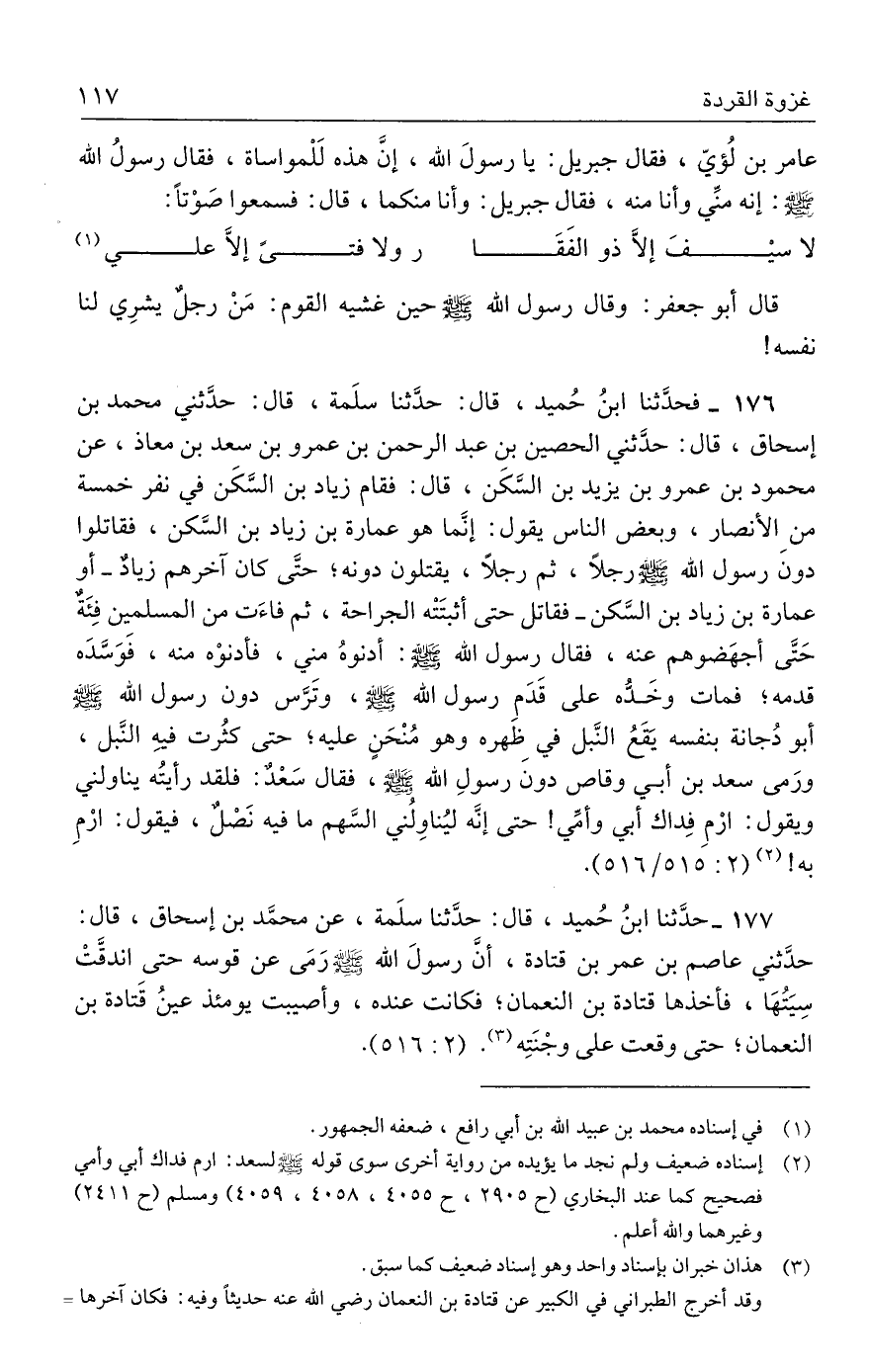 ١٧٦ - فحدَّثنا ابنُ حُميد، قال: حدَّثنا سلَمة، قال: حدَّثني محمد بن إسحاق، قال: حدَّثني الحصين بن عبد الرحمن بن عمرو بن سعد بن معاذ، عن محمود بن عمرو بن يزيد بن السَّكَن، قال: فقام زياد بن السَّكَن في نفر خمسة من الأنصار، وبعض الناس يقول: إنَّما هو عمارة بن زياد بن السَّكن، فقاتلوا دون رسول الله - صلى الله عليه وسلم - رجلًا، ثم رجلًا، يقتلون دونه؛ حتَّى كان آخرهم زيادٌ -أو عمارة بن زياد بن السَّكن- فقاتل حتى أثبتَتْه الجراحة، ثم فاءَت من المسلمين فِئَةٌ حَتَّى أجهَضوهم عنه، فقال رسول الله - صلى الله عليه وسلم -: أدنوهُ مني، فأدنوْه منه، فَوَسَّدَه قدمه؛ فمات وخَدُّه على قَدَمِ رسول الله - صلى الله عليه وسلم -، وتَرَّس دون رسول الله - صلى الله عليه وسلم - أبو دُجانة بنفسه يَقَعُ النَّبل في ظهره وهو مُنْحَنٍ عليه؛ حتى كثُرت فيهِ النَّبل، ورَمى سعد بن أبي وقاص دونَ رسولِ الله - صلى الله عليه وسلم -، فقال سَعْدٌ: فلقد رأيتُه يناولني ويقول: ارْمِ فِداك أبي وأمِّي! حتى إنَّه ليُناولُني السَّهم ما فيه نَصْلٌ، فيقول: ارْمِ به! (٢) (٢: ٥١٥/ ٥١٦).