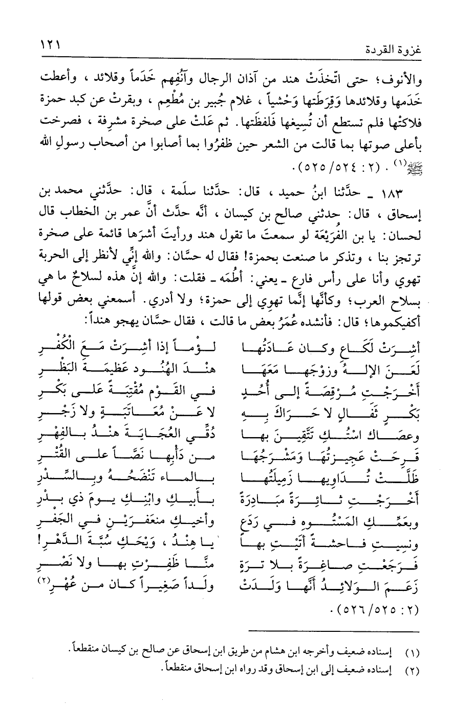 ١٨٣ - حدَّثنا ابنُ حميد، قال: حدَّثنا سلَمة، قال: حدَّثني محمد بن إسحاق، قال: حدثني صالح بن كيسان، أنَّه حدَّث أن عمر بن الخطاب قال لحسان: يا بن الفُرَيعَة لو سمعت ما تقول هند ورأيتَ أشرَها قائمة على صخرة ترتجز بنا، وتذكر ما صنعت بحمزة! فقال له حسَّان: والله إنَي لأنظر إلى الحربة تهوي وأنا على رأس فارع -يعني: أطُمَه- فقلت: والله إنَّ هذه لسلاحٌ ما هي بسلاح العرب؛ وكأنَّها إنَّما تهوي إلى حمزة؛ ولا أدري. أسمعني بعض قولها أكفيكموها؛ قال: فأنشده عُمَرُ بعض ما قالت، فقال حسَّان يهجو هندًا: