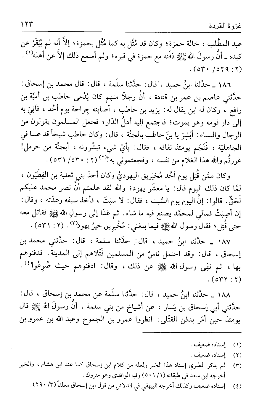 ١٨٧ - حدَّثنا ابنُ حميد، قال: حدَّثنا سلمة، قال: حدَّثني محمد بن إسحاق، قال: وقد احتمل ناسٌ من المسلمين قَتْلاهم إلى المدينة. فدفنوهم بها، ثم نهَى رسول الله - صلى الله عليه وسلم - عن ذلك، وقال: ادفنوهم حيث صُرِعُوا (٤). (٢: ٥٣٢).