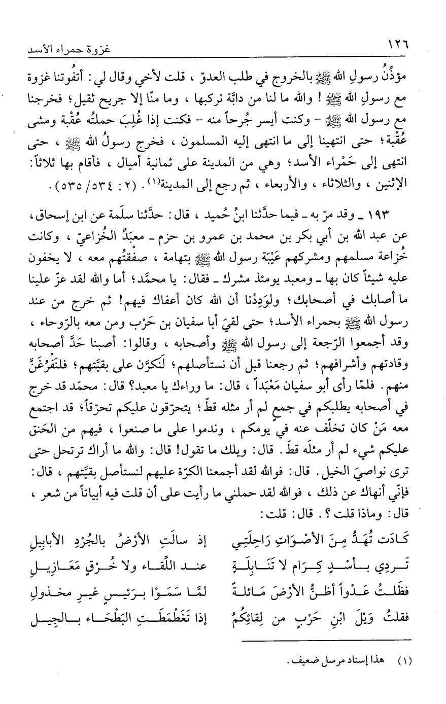 مؤذِّنُ رسولِ الله - صلى الله عليه وسلم - بالخروج في طلب العدوّ، قلت لأخي وقال لي: أتفُوتنا غزوة مع رسولِ الله - صلى الله عليه وسلم - والله ما لنا من دابَّة نركبها، وما منّا إلا جريح ثقيل؛ فخرجنا مع رسول الله - صلى الله عليه وسلم - وكنت أيسر جُرحًا منه -فكنت إذا غُلِبَ حملتُه عُقْبة ومشى عُقْبة؛ حتى انتهينا إلى ما انتهى إليه المسلمون، فخرج رسولُ الله - صلى الله عليه وسلم -، حتى انتهى إلى حَمْراء الأسد؛ وهي من المدينة على ثمانية أميال، فأقام بها ثلاثًا: الإثنين، والثلاثاء، والأربعاء، ثم رجع إلى المدينة (١). (٢: ٥٣٤/ ٥٣٥).