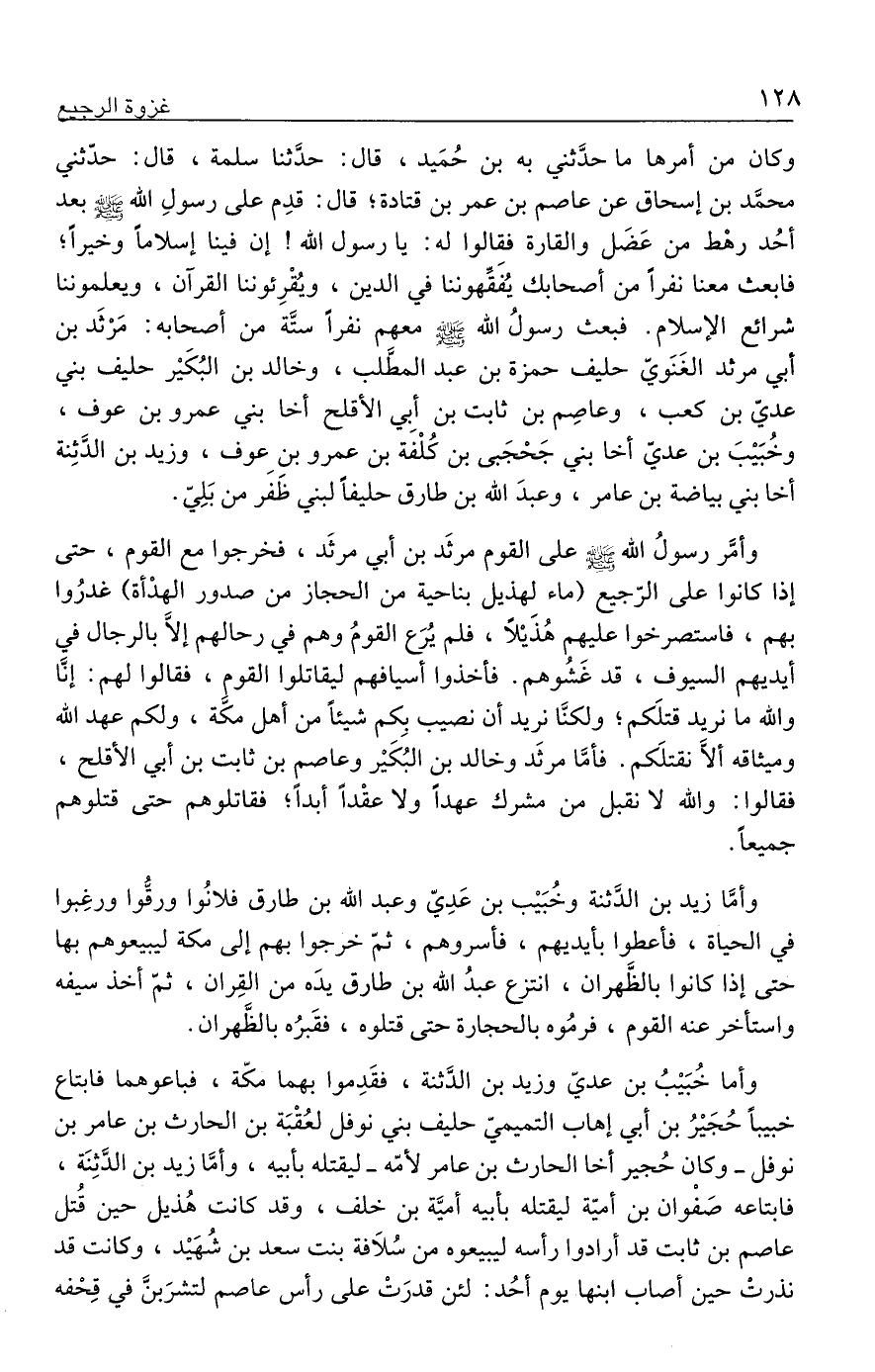 وأمَّر رسولُ الله - صلى الله عليه وسلم - على القوم مرثَد بن أبي مرثَد، فخرجوا مع القوم، حتى إذا كانوا على الرّجيع (ماء لهذيل بناحية من الحجاز من صدور الهدْأة) غدرُوا بهم، فاستصرخوا عليهم هُذَيلًا، فلم يُرَع القومُ وهم في رحالهم إلَّا بالرجال في أيديهم السيوف، قد غَشُوهم. فأخذوا أسيافهم ليقاتلوا القوم، فقالوا لهم: إنَّا والله ما نريد قتلَكم؛ ولكنَّا نريد أن نصيب بِكم شيئًا من أهل مكَّة، ولكم عهد الله وميثاقه ألَّا نقتلَكم. فأمَّا مرثَد وخالد بن البُكَير وعاصم بن ثابت بن أبي الأقلح، فقالوا: والله لا نقبل من مشرك عهدًا ولا عقْدًا أبدًا؛ فقاتلوهم حتى قتلوهم جميعًا.