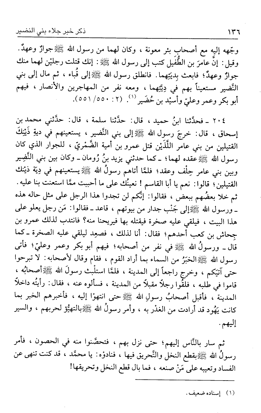 ٢٠٤ - فحدَّثنا ابنُ حميد، قال: حدَّثنا سلمة، قال: حدَّثني محمد بن إسحاق، قال: خرجَ رسول الله - صلى الله عليه وسلم - إلى بني النَّضير، يستعينهم في ديةِ ذَينِكَ القتيلين من بني عامر اللَّذَين قتل عمرو بن أمية الضَّمْريّ، للجوار الذي كان رسول الله - صلى الله عليه وسلم - عقده لهما؛ -كما حدثني يزيد بن رُومان- وكان بين بني النَّضِير وبين بني عامر حِلْف وعقد؛ فلمَّا أتاهم رسولُ الله - صلى الله عليه وسلم - يستعينهم في دِيَة ذينك القتيلين؛ قالوا: نعم يا أبا القاسم! نعينُك على ما أحببت ممِّا استعنت بنا عليه. ثم خلا بعضُهم ببعض، فقالوا: إنَّكم لن تجدوا هذا الرجل على مثل حاله هذه -ورسول الله - صلى الله عليه وسلم - إلى جَنْب جدار من بيوتهم، قاعد- فقالوا: مَن رجل يعلو على هذا البيت، فيلقي عليه صخرة فيقتله بها فيريحنا منه؟ فانتدب لذلك عمرو بن جِحاش بن كعب أحدهم؛ فقال: أنا لذلك، فصعِد ليلقي عليه الصخرة -كما قال- ورسولُ الله - صلى الله عليه وسلم - في نفر من أصحابه؛ فيهم أبو بكر وعمر وعليّ؛ فأتى رسول الله - صلى الله عليه وسلم - الخبَرُ من السماء بما أراد القوم، فقام وقال لأصحابه: لا تبرحوا حتى آتيَكم، وخرج راجعًا إلى المدينة، فلمَّا استلْبث رسولَ الله - صلى الله عليه وسلم - أصحابُه، قاموا في طلبه، فلقُوا رجلًا مقبلًا من المدينة، فسألوه عنه، فقال: رأيتُه داخلًا المدينة، فأقبل أصحابُ رسول الله - صلى الله عليه وسلم - حتى انتهوْا إليه، فأخبرهم الخبر بما كانت يَهُود قد أرادت من الغدْر به، وأمر رسول الله - صلى الله عليه وسلم - بالتهيُّؤ لحربهم، والسير إليهم.