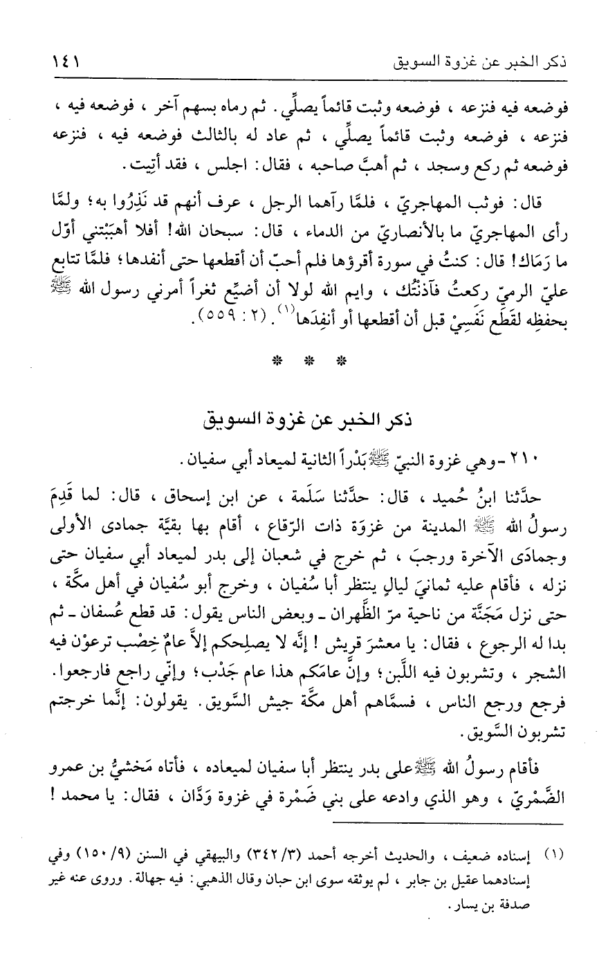 حدَّثنا ابنُ حُميد، قال: حدَّثنا سَلَمة، عن ابن إسحاق، قال: لما قَدِمَ رسولُ الله - صلى الله عليه وسلم - المدينة من غزوَة ذات الرّقاع، أقام بها بقيَّة جمادى الأولى وجمادَى الآخرة ورجبَ، ثم خرج في شعبان إلى بدر لميعاد أبي سفيان حتى نزله، فأقام عليه ثمانيَ ليالٍ ينتظر أبا سُفيان، وخرج أبو سُفيان في أهل مكَّة، حتى نزل مَجَنَّة من ناحية مرّ الظهران -وبعض الناس يقول: قد قطع عُسفان- ثم بدا له الرجوع، فقال: يا معشرَ قريش! إنَّه لا يصلِحكم إلَّا عامٌ خِصْب ترعوْن فيه الشجر، وتشربون فيه اللَّبن؛ وإنَّ عامَكم هذا عام جَدْب؛ وإنّي راجع فارجعوا. فرجع ورجع الناس، فسمَّاهم أهل مكَّة جيش السَّويق. يقولون: إنَّما خرجتم تشربون السَّويق.
