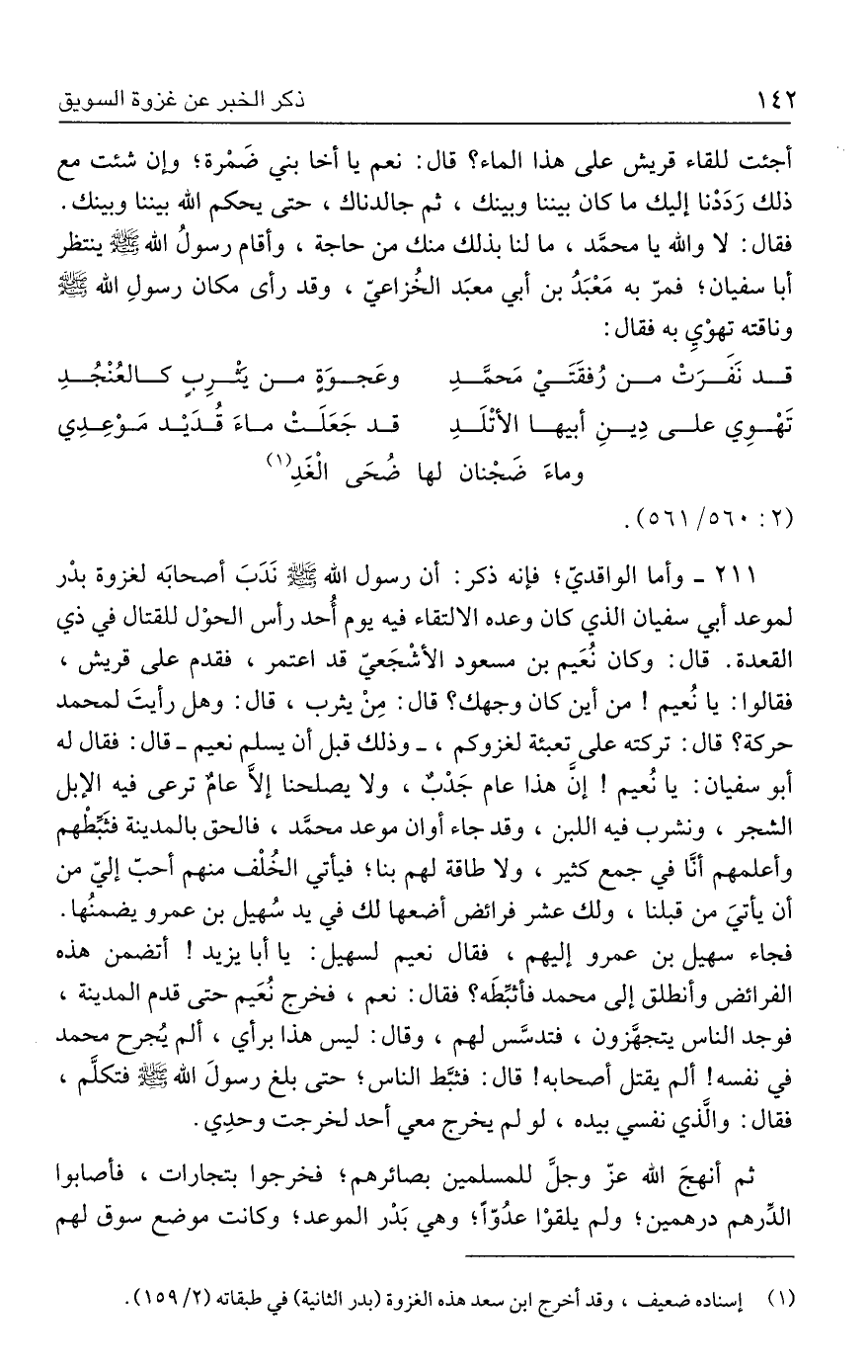 ٢١١ - وأما الواقديّ؛ فإنه ذكر: أن رسول الله - صلى الله عليه وسلم - نَدَبَ أصحابَه لغزوة بدْر لموعد أبي سفيان الذي كان وعده الالتقاء فيه يوم أُحد رأس الحوْل للقتال في ذي القعدة. قال: وكان نُعَيم بن مسعود الأشْجَعيّ قد اعتمر، فقدم على قريش، فقالوا: يا نُعيم! من أين كان وجهك؟ قال: مِنْ يثرب، قال: وهل رأيتَ لمحمد حركة؟ قال: تركته على تعبئة لغزوكم، -وذلك قبل أن يسلم نعيم- قال: فقال له أبو سفيان: يا نُعيم! إنَّ هذا عام جَدْبٌ، ولا يصلحنا إلَّا عامٌ ترعى فيه الإبل الشجر، ونشرب فيه اللبن، وقد جاء أوان موعد محمَّد، فالحق بالمدينة فثَبِّطْهم وأعلمهم أنَّا في جمع كثير، ولا طاقة لهم بنا؛ فيأتي الخُلْف منهم أحبّ إليّ من أن يأتيَ من قبلنا، ولك عشر فرائض أضعها لك في يد سُهيل بن عمرو يضمنُها. فجاء سهيل بن عمرو إليهم، فقال نعيم لسهيل: يا أبا يزيد! أتضمن هذه الفرائض وأنطلق إلى محمد فأثبِّطَه؟ فقال: نعم، فخرج نُعَيم حتى قدم المدينة، فوجد الناس يتجهَّزون، فتدسَّس لهم، وقال: ليس هذا برأي، ألم يُجرح محمد في نفسه! ألم يقتل أصحابه! قال: فثبَّط الناس؛ حتى بلغ رسولَ الله - صلى الله عليه وسلم - فتكلَّم، فقال: والَّذي نفسي بيده، لو لم يخرج معي أحد لخرجت وحدِي.