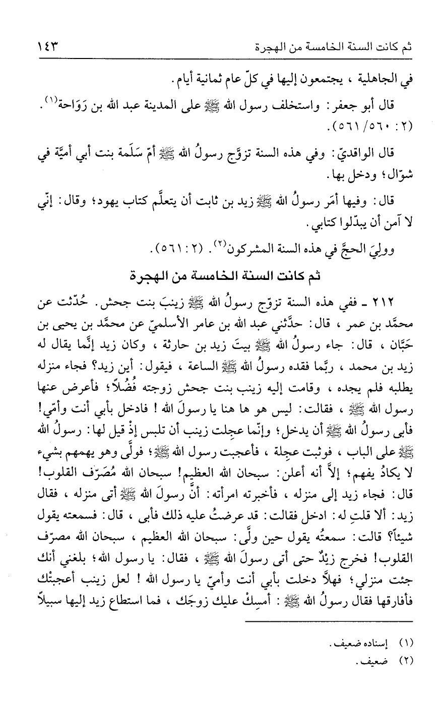 ٢١٢ - ففي هذه السنة تزوّج رسولُ الله - صلى الله عليه وسلم - زينبَ بنت جحش. حُدّثت عن محمَّد بن عمر، قال: حدَّثني عبد الله بن عامر الأسلميّ عن محمَّد بن يحيى بن حَبَّان، قال: جاء رسولُ الله - صلى الله عليه وسلم - بيتَ زيد بن حارثة، وكان زيد إنَّما يقال له زيد بن محمد، ربَّما فقده رسولُ الله - صلى الله عليه وسلم - الساعة، فيقول: أين زيد؟ فجاء منزله يطلبه فلم يجده، وقامت إليه زينب بنت جحش زوجته فُضُلًا؛ فأعرض عنها رسول الله - صلى الله عليه وسلم -، فقالت: ليس هو ها هنا يا رسولَ الله! فادخل بأبي أنت وأمّي! فأبى رسولُ الله - صلى الله عليه وسلم - أن يدخل؛ وإنّما عجِلت زينب أن تلبس إذْ قيل لها: رسولُ الله - صلى الله عليه وسلم - على الباب، فوثبت عجِلة، فأعجبت رسول الله - صلى الله عليه وسلم -، فولَّى وهو يهمهم بشيء لا يكادُ يفهم؛ إلَّا أنه أعلن: سبحان الله العظيم! سبحان الله مُصَرّف القلوب! قال: فجاء زيد إلى منزله، فأخبرته امرأته: أن رسولَ الله - صلى الله عليه وسلم - أتى منزله، فقال زيد: ألا قلتِ له: ادخل فقالت: قد عرضتُ عليه ذلك فأبى، قال: فسمعته يقول شيئًا؟ قالت: سمعتُه يقول حين ولَّى: سبحان الله العظيم، سبحان الله مصرّف القلوب! فخرج زيدٌ حتى أتى رسولَ الله - صلى الله عليه وسلم -، فقال: يا رسول الله؛ بلغني أنك جئت منزلي؛ فهلَّا دخلت بأبي أنت وأميّ يا رسول الله! لعل زينب أعجبتْك فأفارقها فقال رسولُ الله - صلى الله عليه وسلم -: أمسِكْ عليك زوجَك، فما استطاع زيد إليها سبيلًا