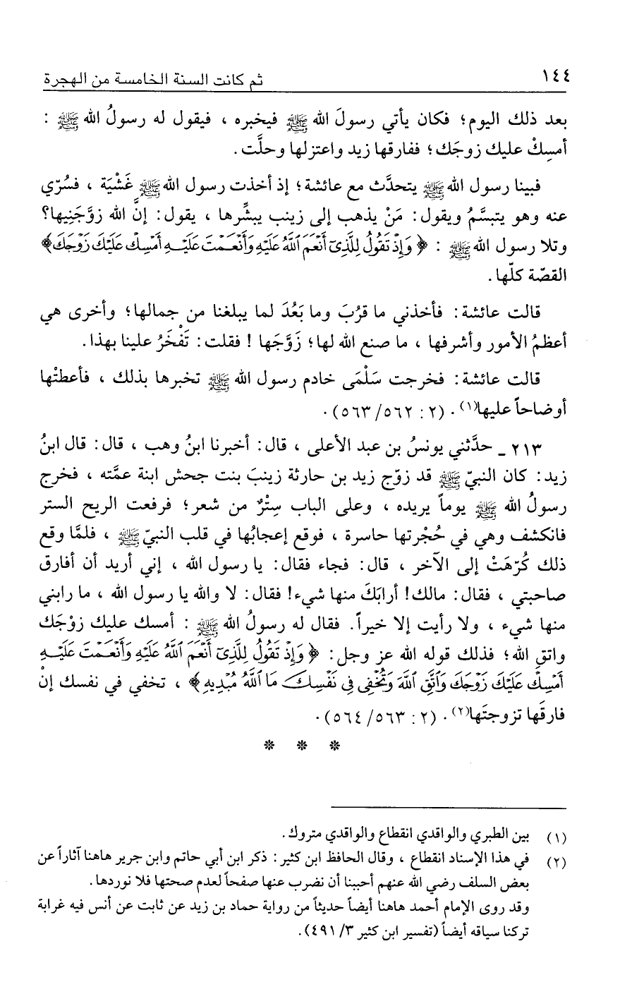 ٢١٣ - حدَّثني يونسُ بن عبد الأعلى، قال: أخبرنا ابنُ وهب، قال: قال ابنُ زيد: كان النبيّ - صلى الله عليه وسلم - قد زوّج زيد بن حارثة زينبَ بنت جحش ابنة عمَّته، فخرج رسولُ الله - صلى الله عليه وسلم - يومًا يريده، وعلى الباب سِتْرٌ من شعر؛ فرفعت الريح الستر فانكشف وهي في حُجْرتها حاسرة، فوقع إعجابُها في قلب النبيّ - صلى الله عليه وسلم -، فلمَّا وقع ذلك كُرّهَتْ إلى الآخر، قال: فجاء فقال: يا رسول الله، إني أريد أن أفارق صاحبتي، فقال: ما لك! أرابَكَ منها شيء! فقال: لا والله يا رسول الله، ما رابني منها شيء، ولا رأيت إلا خيرًا. فقال له رسولُ الله - صلى الله عليه وسلم -: أمسك عليك زوْجَك واتقِ الله؛ فذلك قوله الله عزَّ وجلَّ: {وَإِذْ تَقُولُ لِلَّذِي أَنْعَمَ اللَّهُ عَلَيهِ وَأَنْعَمْتَ عَلَيهِ أَمْسِكْ عَلَيكَ زَوْجَكَ وَاتَّقِ اللَّهَ وَتُخْفِي فِي نَفْسِكَ مَا اللَّهُ مُبْدِيهِ}، تخفي في نفسك إنْ فارقَها تزوجتَها (٢). (٢: ٥٦٣/ ٥٦٤).