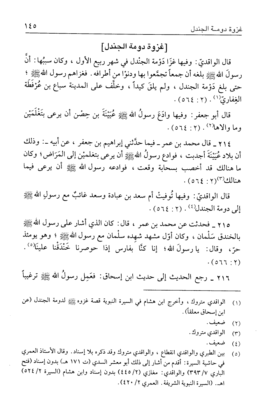 (١) الواقدي متروك، وأخرج ابن هشام في السيرة النبوية قصة غزوة - صلى الله عليه وسلم - لدومة الجندل (عن ابن إسحاق معلقًا).