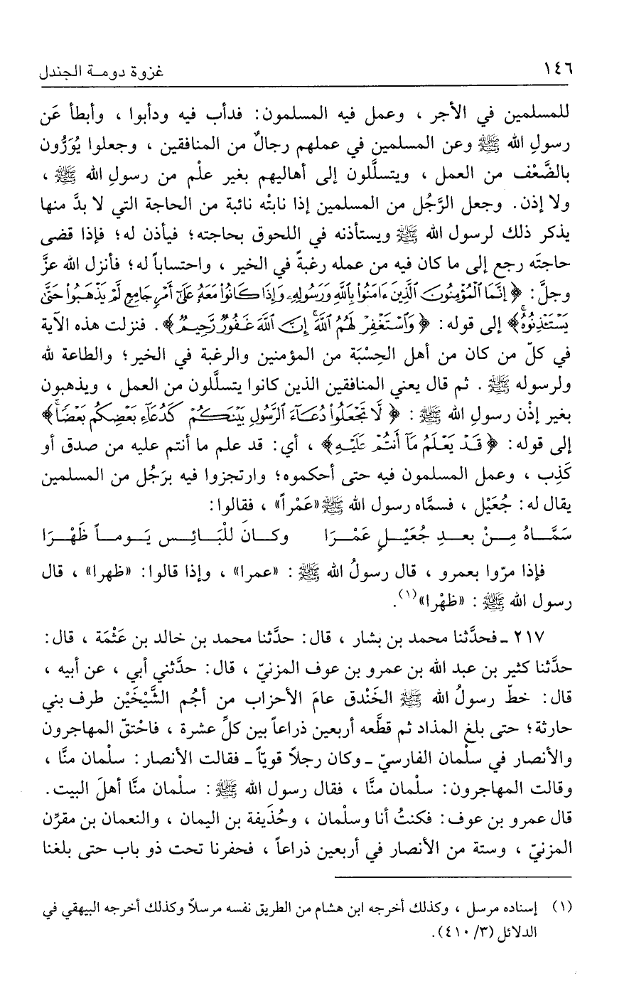٢١٧ - فحدَّثنا محمد بن بشار، قال: حدَّثنا محمد بن خالد بن عَثْمَة، قال: حدَّثنا كثير بن عبد الله بن عمرو بن عوف المزنيّ، قال: حدَّثني أبي، عن أبيه، قال: خط رسولُ الله - صلى الله عليه وسلم - الخَنْدق عامَ الأحزاب من أجُم الشَّيخَين طرف بني حارثة؛ حتى بلغ المذاد ثم قطَّعه أربعين ذراعًا بين كلِّ عشرة، فاحْتقّ المهاجرون والأنصار في سلْمان الفارسيّ -وكان رجلًا قوتًا- فقالت الأنصار: سلْمان منَّا، وقالت المهاجرون: سلْمان منَّا، فقال رسول الله - صلى الله عليه وسلم -: سلْمان منَّا أهلَ البيت. قال عمرو بن عوف: فكنتُ أنا وسلْمان، وحُذَيفة بن اليمان، والنعمان بن مقرِّن المزنيّ، وستة من الأنصار في أربعين ذراعًا، فحفرنا تحت ذو باب حتى بلغنا