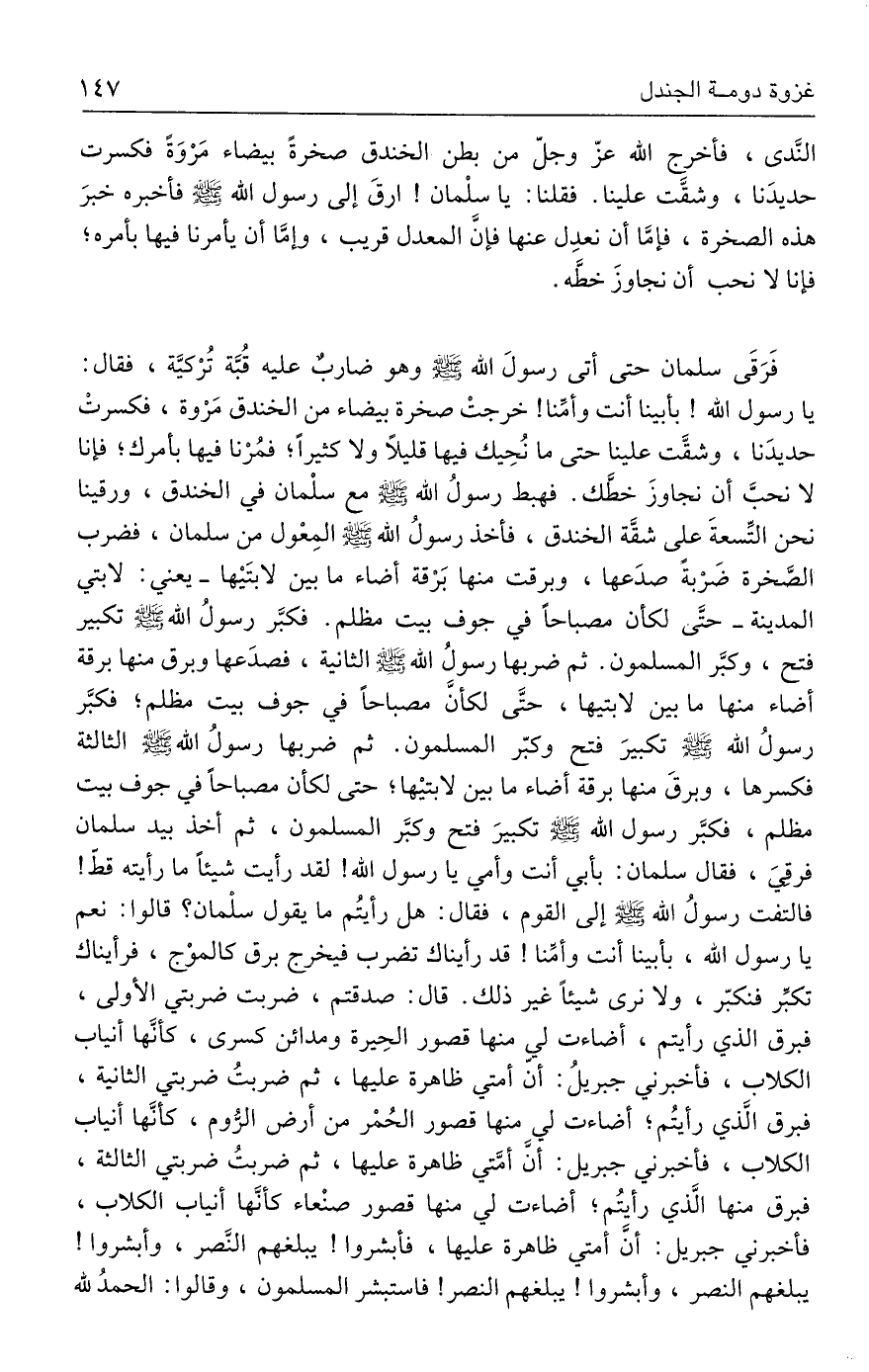 فَرَقَى سلمان حتى أتى رسول الله - صلى الله عليه وسلم - وهو ضاربٌ عليه قُبَّة تُرْكيَّة، فقال: يا رسول الله! بأبينا أنت وأمِّنا! خرجتْ صخرة بيضاء من الخندق مَرْوة، فكسرتْ حديدَنا، وشقَّت علينا حتى ما نُحِيك فيها قليلًا ولا كثيرًا؛ فمُرْنا فيها بأمرك؛ فإنا لا نحبَّ أن نجاوزَ خطَّك. فهبط رسول الله - صلى الله عليه وسلم - مع سلْمان في الخندق، ورقينا نحن التِّسعةَ على شقَّة الخندق، فأخذ رسول الله - صلى الله عليه وسلم - المِعْول من سلمان، فضرب الصَّخرة ضَرْبةً صدَعها، وبرقت منها بَرْقة أضاء ما بين لابتَيها -يعني: لابتي المدينة- حتَّى لكأن مصباحًا في جوف بيت مظلم. فكبَّر رسول الله - صلى الله عليه وسلم - تكبير فتح، وكبَّر المسلمون. ثم ضربها رسول الله - صلى الله عليه وسلم - الثانية، فصدَعها وبرق منها برقة أضاء منها ما بين لابتيها، حتَّى لكأنَ مصباحًا في جوف بيت مظلم؛ فكبَّر رسول الله - صلى الله عليه وسلم - تكبيرَ فتح وكبّر المسلمون. ثم ضربها رسولُ الله - صلى الله عليه وسلم - الثالثة فكسرها، وبرقَ منها برقة أضاء ما بين لابتيها؛ حتى لكأن مصباحًا في جوف بيت مظلم، فكبَّر رسول الله - صلى الله عليه وسلم - تكبيرَ فتح وكبَّر المسلمون، ثم أخذ بيد سلمان فرقِيَ، فقال سلمان: بأبي أنت وأمي يا رسول الله! لقد رأيت شيئًا ما رأيته قطّ! فالتفت رسول الله - صلى الله عليه وسلم - إلى القوم، فقال: هل رأيتُم ما يقول سلْمان؟ قالوا: نعم يا رسول الله، بأبينا أنت وأمِّنا! قد رأيناك تضرب فيخرج برق كالموْج، فرأيناك تكبِّر فنكبّر، ولا نرى شيئًا غير ذلك. قال: صدقتم، ضربت ضربتي الأولى، فبرق الذي رأيتم، أضاءت لي منها قصور الحِيرة ومدائن كسرى، كأنَّها أنياب الكلاب، فأخبرني جبريلُ: أنّ أمتي ظاهرة عليها، ثم ضربتُ ضربتي الثانية، فبرق الذي رأيتُم، أضاءت لي منها قصور الحُيرة ومدائن كسرى، كأنَّها أنياب الكلاب، فأخبرني جبريلُ: أن أمَّتي ظاهرة عليها، ثم ضربتُ ضربتي الثالثة، فبرق الَّذي رأيتُم؛ أضاءت لي منها قصور الحُمْر من أرض الرُّوم، كأنها أنياب الكلاب، فأخبرني جبريل: أن أمتي ظاهرة عليها، فأبشروا! يبلغهم النَّصر، وأبشروا! يبلغهم النصر، وأبشروا! يبلغهم النصر! فاستبشر المسلمون، وقالوا: الحمدُ لله