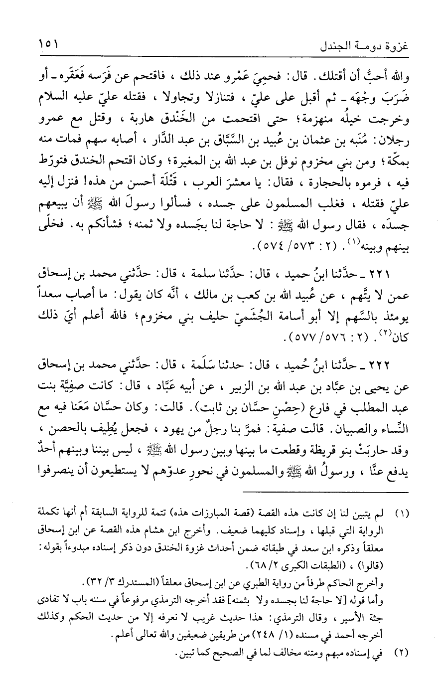 ٢٢٢ - حدَّثنا ابنُ حُميد، قال: حدثنا سَلَمة، قال: حدَّثني محمد بن إسحاق عن يحيى بن عبَّاد بن عبد الله بن الزبير، عن أبيه عَبَّاد، قال: كانت صفِيَّة بنت عبد المطلب في فارع (حِصْنِ حسَّان بن ثابت). قالت: وكان حسَّان مَعَنا فيه مع النِّساء والصبيان. قالت صفية: فمرَّ بنا رجلٌ من يهود، فجعل يُطِيف بالحصن، وقد حاربَتْ بنو قريظة وقطعت ما بينها وبين رسول الله - صلى الله عليه وسلم -، ليس بيننا وبينهم أحدٌ يدفع عنَّا، ورسولُ الله - صلى الله عليه وسلم - والمسلمون في نحورِ عدوّهم لا يستطيعون أن ينصرفوا