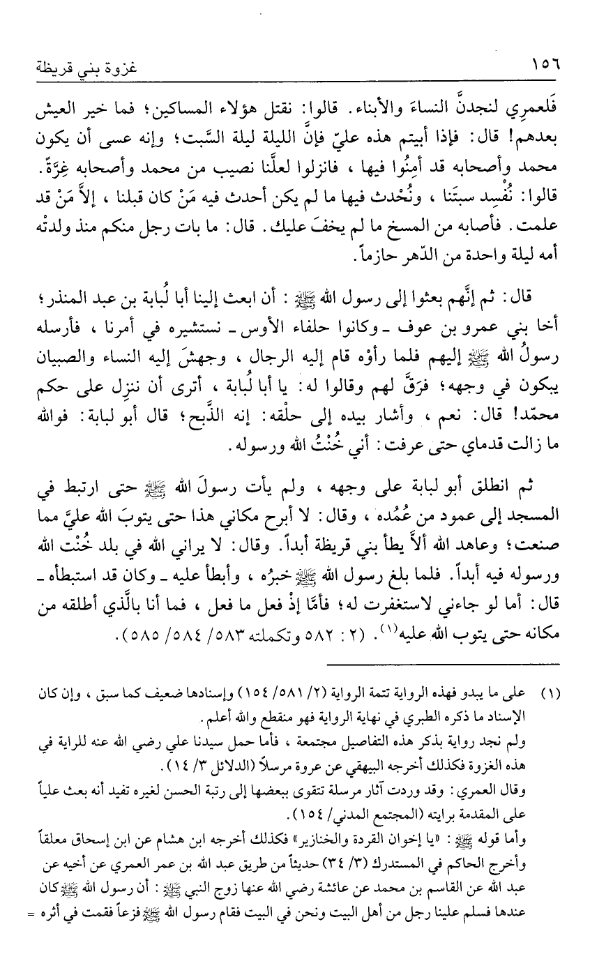 فَلعمرِي لنجدنَّ النساءَ والأبناء. قالوا: نقتل هؤلاء المساكين؛ فما خير العيش بعدهم! قال: فإذا أبيتم هذه عليّ فإنَّ الليلة ليلة السَّبت؛ وإنه عسى أن يكون محمد وأصحابه قد أمِنُوا فيها، فانزلوا لعلَّنا نصيب من محمد وأصحابه غِرَّةً. قالوا: نُفسِد سبتَنا، ونُحْدث فيها ما لم يكن أحدث فيه مَنْ كان قبلنا، إلَّا مَنْ قد علمت. فأصابه من المسخ ما لم يخفَ عليك. قال: ما بات رجل منكم منذ ولدتْه أمه ليلة واحدة من الدّهر حازمًا.