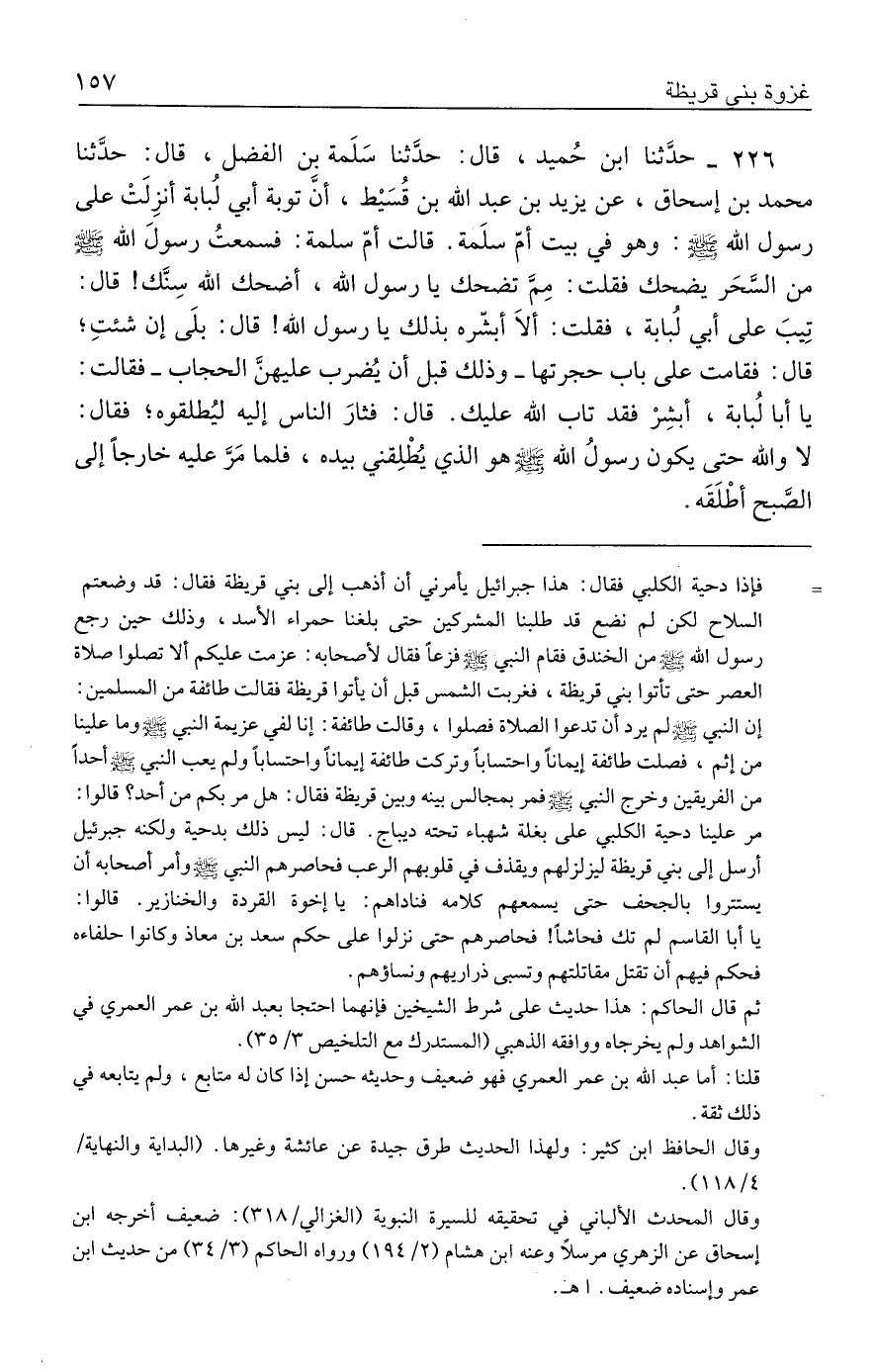 ٢٢٦ - حدَّثنا ابن حُميد، قال: حدَّثنا سَلَمة بن الفضل، قال: حدَّثنا محمد بن إسحاق، عن يزيد بن عبد الله بن قُسَيط، أن توبة أبي لُبابة أنزِلَتْ على رسول الله - صلى الله عليه وسلم -: وهو في بيت أمّ سلَمة. قالت أمّ سلمة: فسمعتُ رسولَ الله - صلى الله عليه وسلم - من السَّحَر يضحك فقلت: مِمَّ تضحك يا رسول الله، أضحك الله سِنَّك! قال: تِيبَ على أبي لُبابة، فقلت: ألا أبشّره بذلك يا رسول الله! قال: بلَى إن شئتِ؛ قال: فقامت على باب حجرتها -وذلك قبل أن يُضرب عليهنَّ الحجاب- فقالت: يا أبا لُبابة، أبشِرْ فقد تاب الله عليك. قال: فثارَ الناس إليه ليُطلقوه؛ فقال: لا والله حتى يكون رسولُ الله - صلى الله عليه وسلم - هو الذي يُطْلِقني بيده، فلما مَرَّ عليه خارجًا إلى الصَّبح أطْلَقَه.