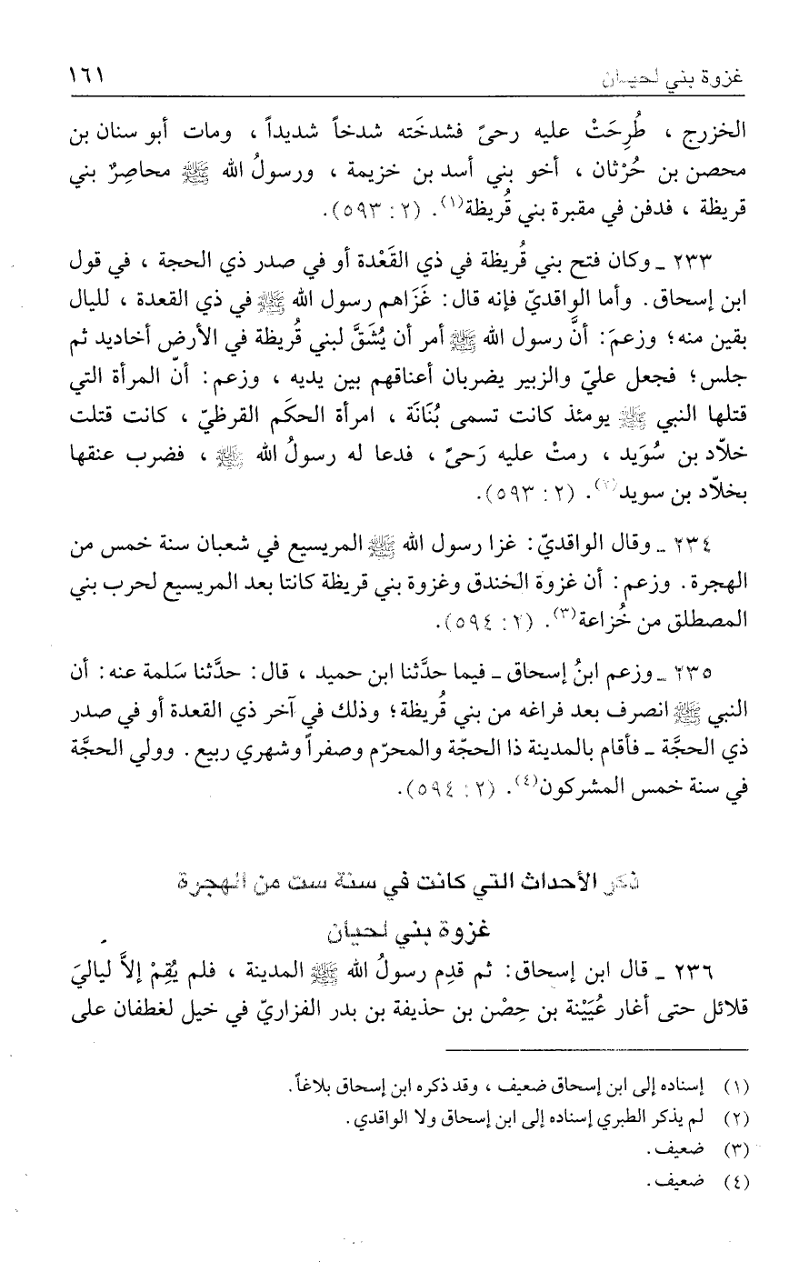 ٢٣٥ - وزعم ابنُ إسحاق -فيما حدَّثنا ابن حميد، قال: حدَّثنا سَلمة عنه: أن النبي - صلى الله عليه وسلم - انصرف بعد فراغه من بني قُريظة؛ وذلك في آخر ذي القعدة أو في صدر ذي الحجَّة- فأقام بالمدينة ذا الحجّة والمحرّم وصفرًا وشهري ربيع. وولي الحجَّة في سنة خمس المشركون (٤). (٢: ٥٩٤).