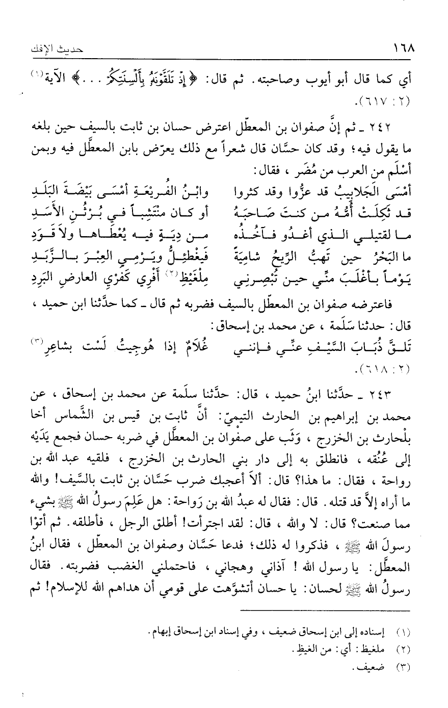 ٢٤٣ - حدَّثنا ابنُ حميد، قال: حدَّثنا سلَمة عن محمد بن إسحاق، عن محمد بن إبراهيم بن الحارث التيميّ: أن ثابت بن قيس بن الشَّماس أخا بلْحارث بن الخزرج، وَثَب على صفْوان بن المعطَّل في ضربه حسان فجمع يَدَيه إلى عُنُقه، فانطلق به إلى دار بني الحارث بن الخزرج، فلقيه عبد الله بن رواحة، فقال: ما هذا؟ قال: ألا أعجبك ضرب حَسَّان بن ثابت بالسَّيف! والله ما أراه إلَّا قد قتله. قال: فقال له عبدُ الله بن رَواحة: هل عَلِمَ رسولُ الله - صلى الله عليه وسلم - بشيء مما صنعت؟ قال: لا والله، قال: لقد اجترأت! أطلق الرجل، فأطلقه. ثم أتوْا رسولَ الله - صلى الله عليه وسلم -، فذكروا له ذلك؛ فدعا حَسَّان وصفوان بن المعطّل، فقال ابنُ المعطَّل: يا رسول الله! آذاني وهجاني، فاحتملني الغضب فضربته. فقال رسولُ الله - صلى الله عليه وسلم - لحسان: يا حسان أتشوَّهت على قومي أن هداهم الله للإسلام! ثم