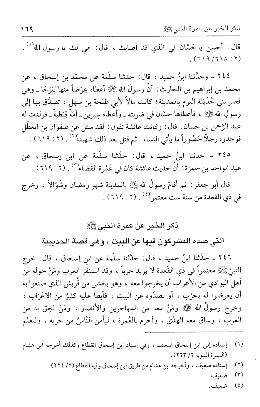 ٢٤٥ - حدثنا ابنُ حميد، قال: حدَّثنا سلَمة عن ابن إسحاق، عن عبد الواحد بن حمزة: أنّ حديث عائشة كان في عُمْرة القضاء (٣). (٢: ٦١٩).