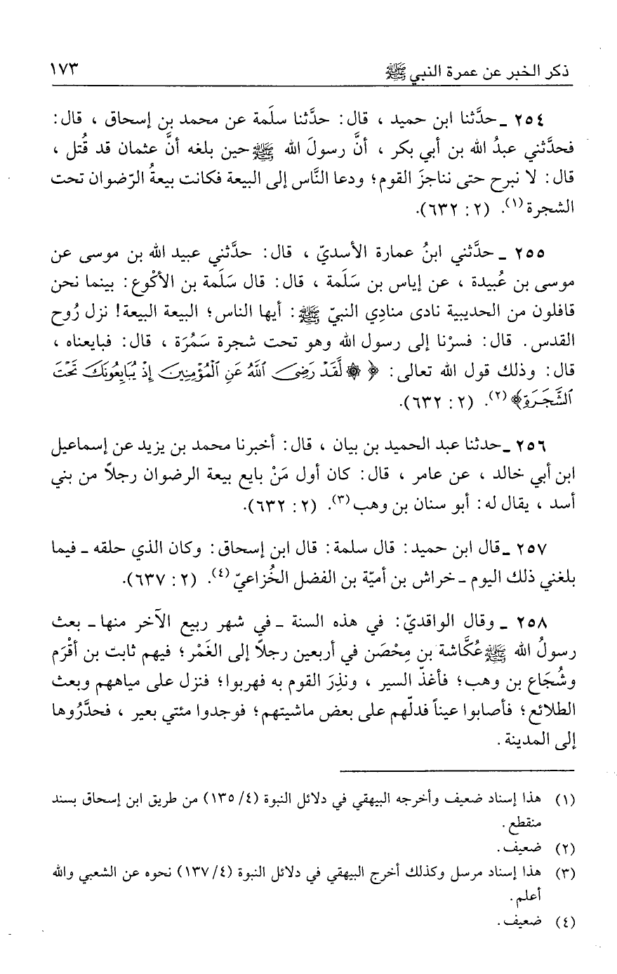 ٢٥٤ - حدَّثنا ابن حميد، قال: حدَّثنا سلَمة عن محمد بن إسحاق، قال: فحدَّثني عبدُ الله بن أبي بكر، أن رسولَ الله - صلى الله عليه وسلم - حين بلغه أن عثمان قد قُتل، قال: لا نبرح حتى نناجزَ القوم؛ ودعا النَّاس إلى البيعة فكانت بيعةُ الرّضوان تحت الشجرة (١). (٢: ٦٣٢).