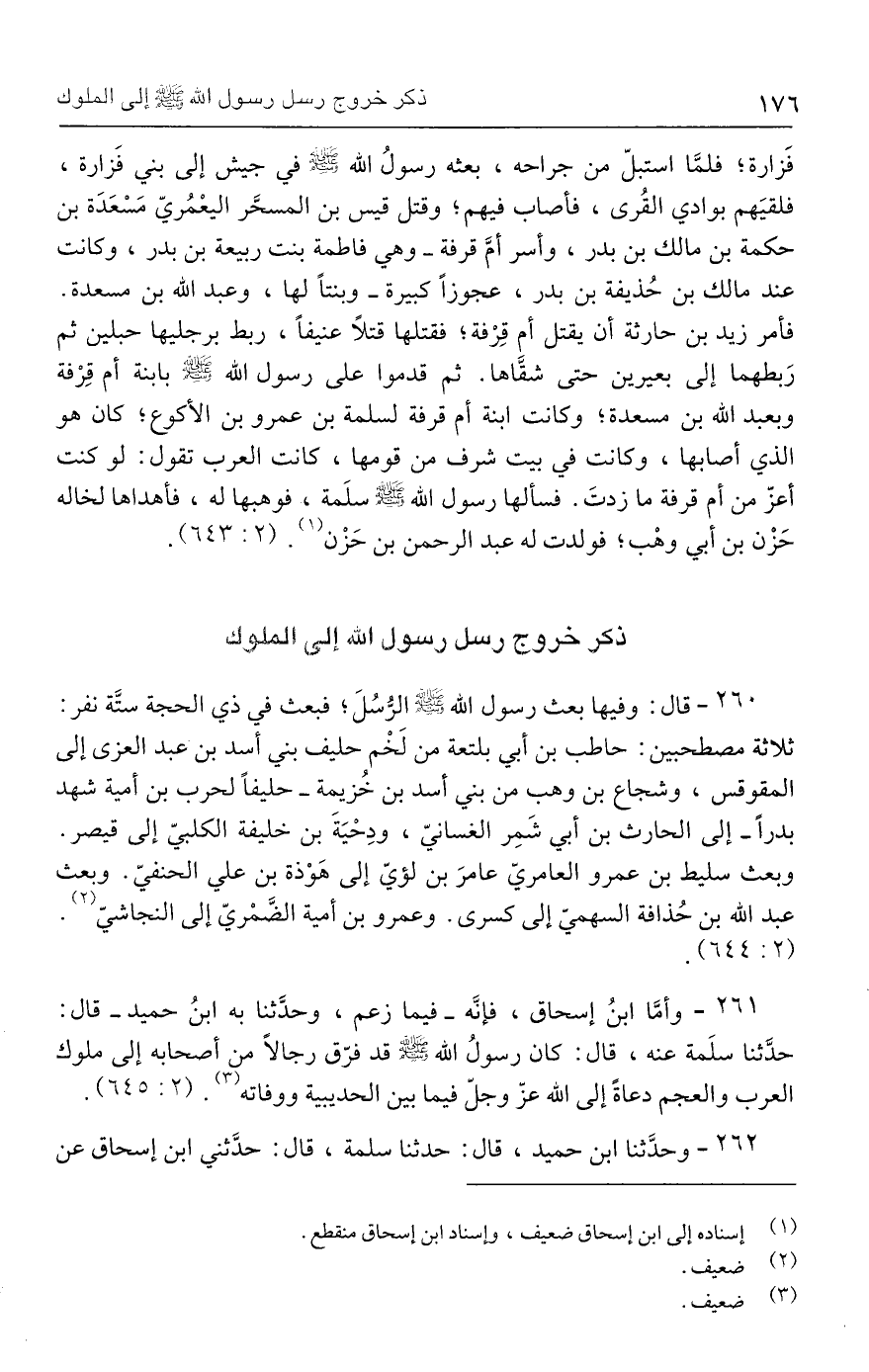 ٢٦١ - وأمَّا ابنُ إسحاق، فإنَّه -فيما زعم، وحدَّثنا به ابنُ حميد- قال: حدَّثنا سلَمة عنه، قال: كان رسولُ الله - صلى الله عليه وسلم - قد فرّق رجالًا من أصحابه إلى ملوك العرب والعجم دعاةً إلى الله عزَّ وجلَّ فيما بين الحديبية ووفاته (٣). (٢: ٦٤٥).
