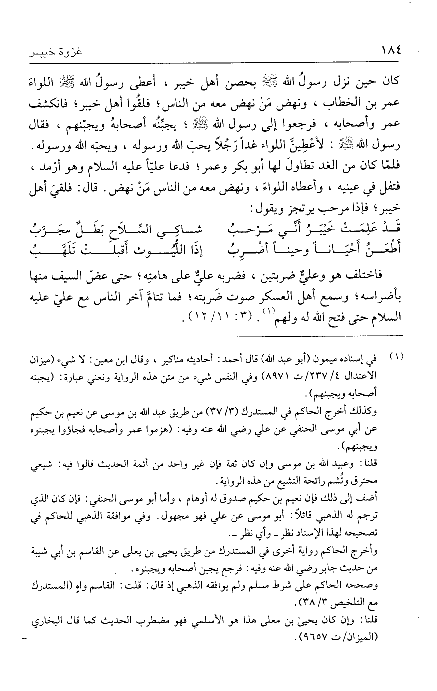 كان حين نزل رسولُ الله - صلى الله عليه وسلم - بحصن أهل خيبر، أعطى رسولُ الله - صلى الله عليه وسلم - اللواءَ عمر بن الخطاب، ونهض مَنْ نهض معه من الناس؛ فلقُوا أهل خيبر؛ فانكشف عمر وأصحابه، فرجعوا إلى رسول الله - صلى الله عليه وسلم -؛ يجبِّنُه أصحابهُ ويجبّنهم، فقال رسول الله - صلى الله عليه وسلم -: لأعْطِينَّ اللواء غدًا رَجُلًا يحبّ الله ورسوله، ويحبّه الله ورسوله. فلمّا كان من الغد تطاولَ لها أبو بكر وعمر؛ فدعا عليًّا - عليه السلام - وهو أرْمد، فتفل في عينيه، وأعطاه اللواءَ، ونهض معه من الناس مَنْ نهض. قال: فلقيَ أهل خيبر؛ فإذا مرحب يرتجز ويقول: