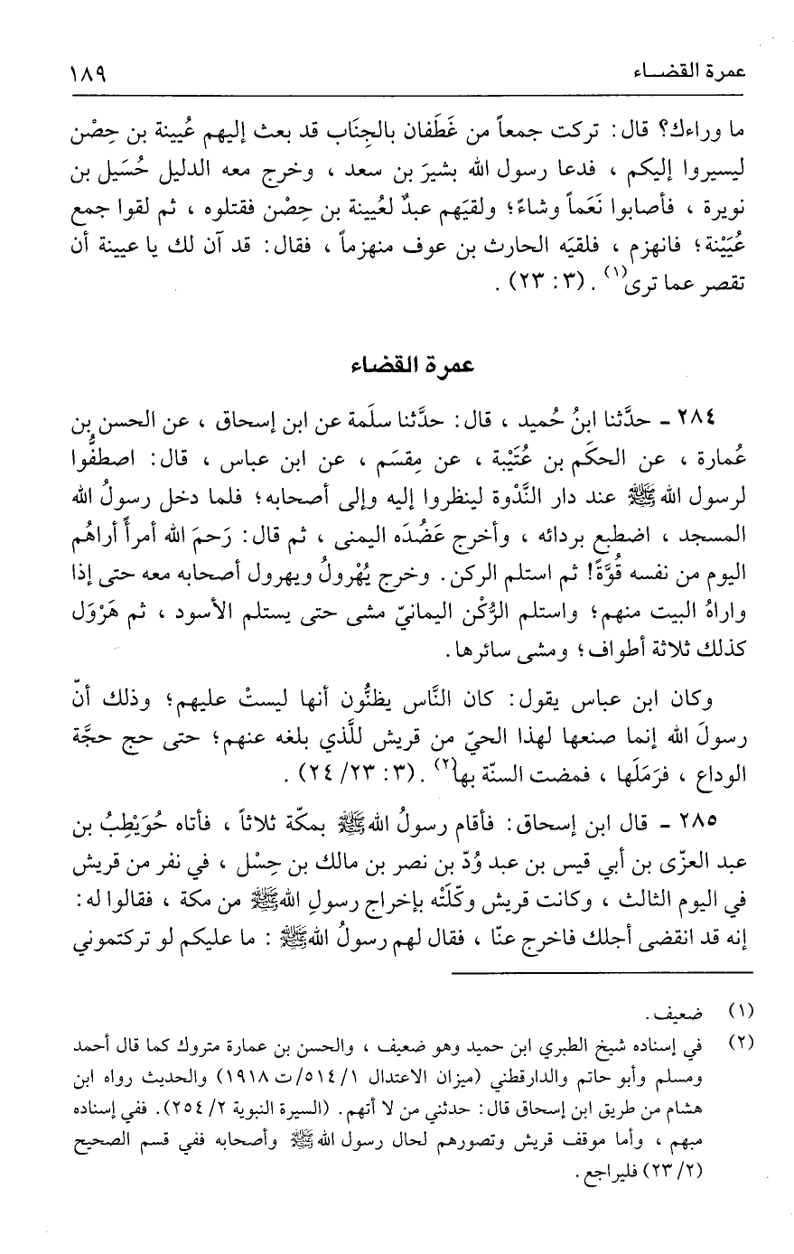 ٢٨٤ - حدَّثنا ابنُ حُميد، قال: حدَّثنا سلَمة عن ابن إسحاق، عن الحسن بن عُمارة، عن الحكَم بن عُتَيبة، عن مِقسَم، عن ابن عباس، قال: اصطفُّوا لرسول الله - صلى الله عليه وسلم - عند دار النَّدْوة لينظروا إليه وإلى أصحابه؛ فلما دخل رسولُ الله المسجد، اضطبع بردائه، وأخرج عَضُدَه اليمنى، ثم قال: رَحمَ الله أمرأ أراهُم اليوم من نفسه قُوَّةً! ثم استلم الركن. وخرج يُهْرولُ ويهرول أصحابه معه حتى إذا واراهُ البيت منهم؛ واستلم الرُّكْن اليمانيّ مشى حتى يستلم الأسود، ثم هَرْوَل كذلك ثلاثة أطواف؛ ومشى سائرها.