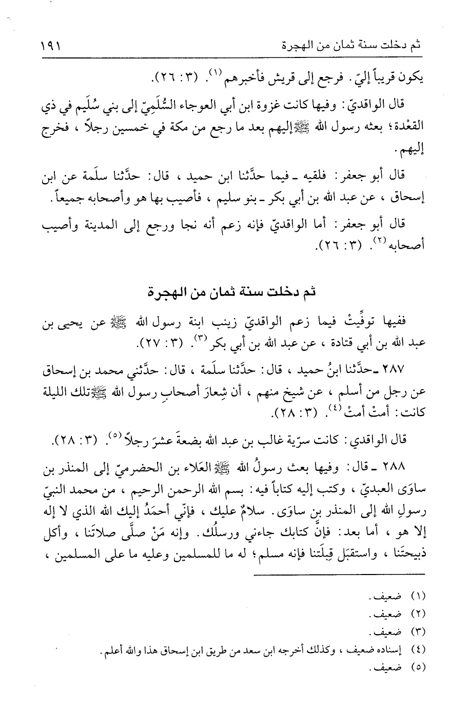٢٨٨ - قال: وفيها بعث رسولُ الله - صلى الله عليه وسلم - العَلاء بن الحضرميّ إلى المنذر بن ساوَى العبديّ، وكتب إليه كتابًا فيه: بسم الله الرحمن الرحيم، من محمد النبيّ رسولِ الله إلى المنذر بن ساوَى. سلامٌ عليك، فإنّي أحمَدُ إليك الله الذي لا إله إلا هو، أما بعد: فإنَّ كتابك جاءني ورسلُك. وإنه مَنْ صلَّى صلاتَنا، وأكلَ ذبيحتَنا، واستقبَل قِبلَتنا فإنه مسلم؛ له ما للمسلمين وعليه ما على المسلمين،